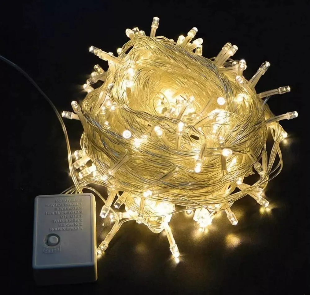 (Luces estilo arroz en tono cálida con 100 lamparitas, ideales para interiores, con enchufe y un interruptor con botón para controlar las intensidades de las luces. Categorizado en: Navidad).