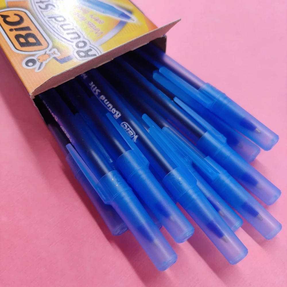 (Biromes marca "Bic" de la línea ''Round Stic'' por 12 unidades de color azul, punta media de 1,0mm. Ideales para uso escolar, de oficina o personal).