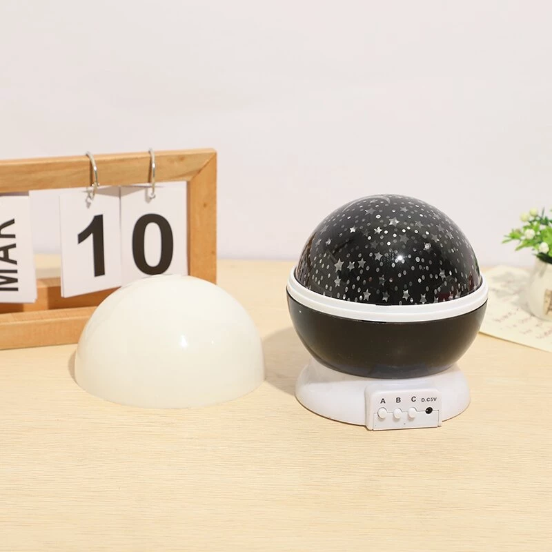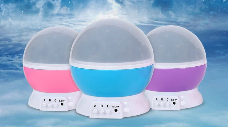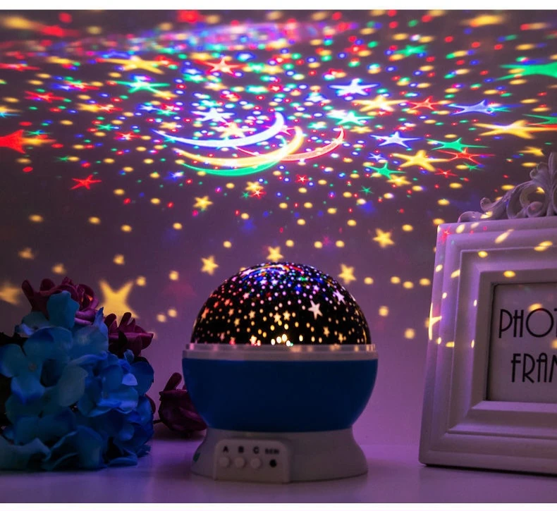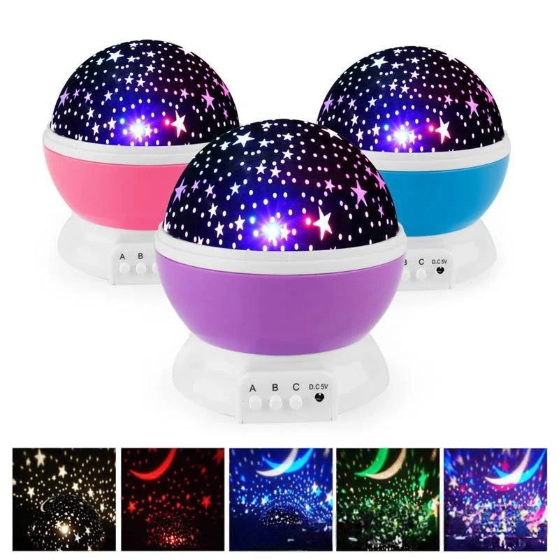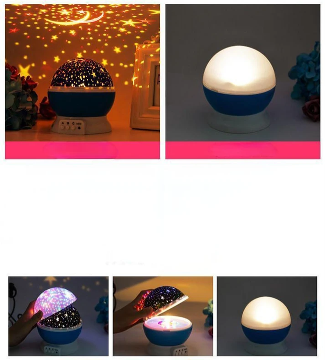 (Proyector de Lámpara Nocturna con diseños de estrellas, varios colores a elección y combinaciones que puedes hacer. Puede ser conectado con con cable USB o a 3 pilas AA).