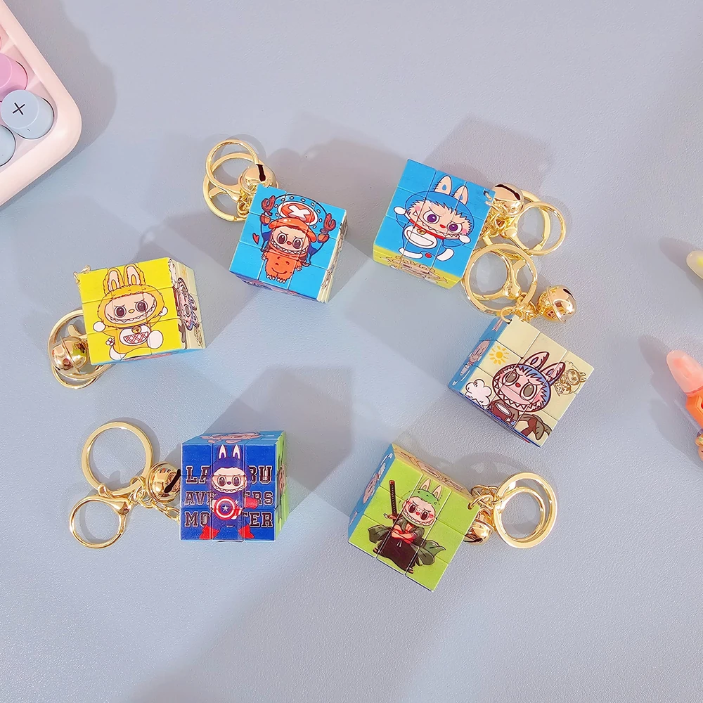 (Llavero en forma de cubo "labubu" en el cual cada cara representa un personaje diferente. Además de un llavero puede servir para un entretenimiento. Trae su aro metálico dorado para poder colocarlo en tus llaves).