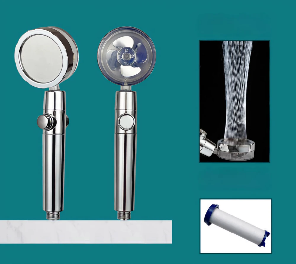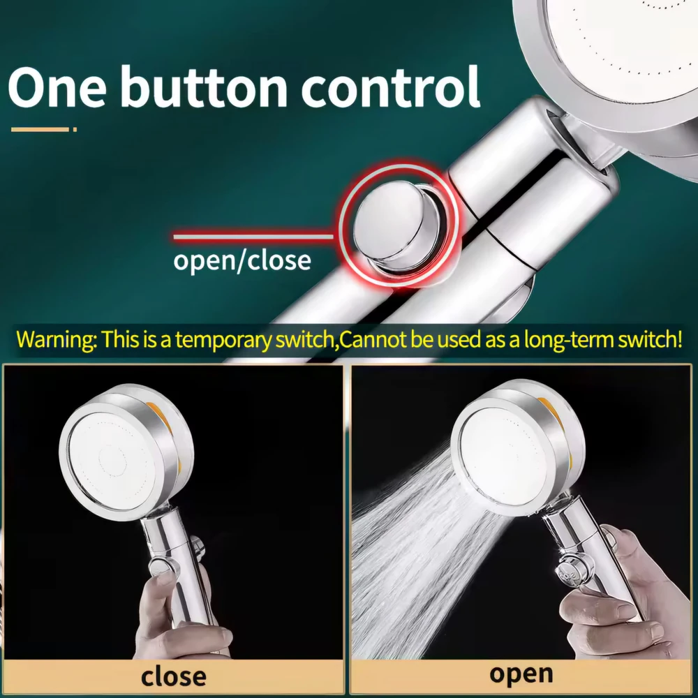 (el cabezal de ducha hace que el flujo de agua genere un flujo presurizado a través de la rueda giratoria, aumentando la velocidad del flujo de agua, tiene un interruptor de encendido/apagado. Simplemente presione el interruptor en el mango de la boquilla para detener el flujo de agua en cualquier momento. Además puede girarse a 360°).