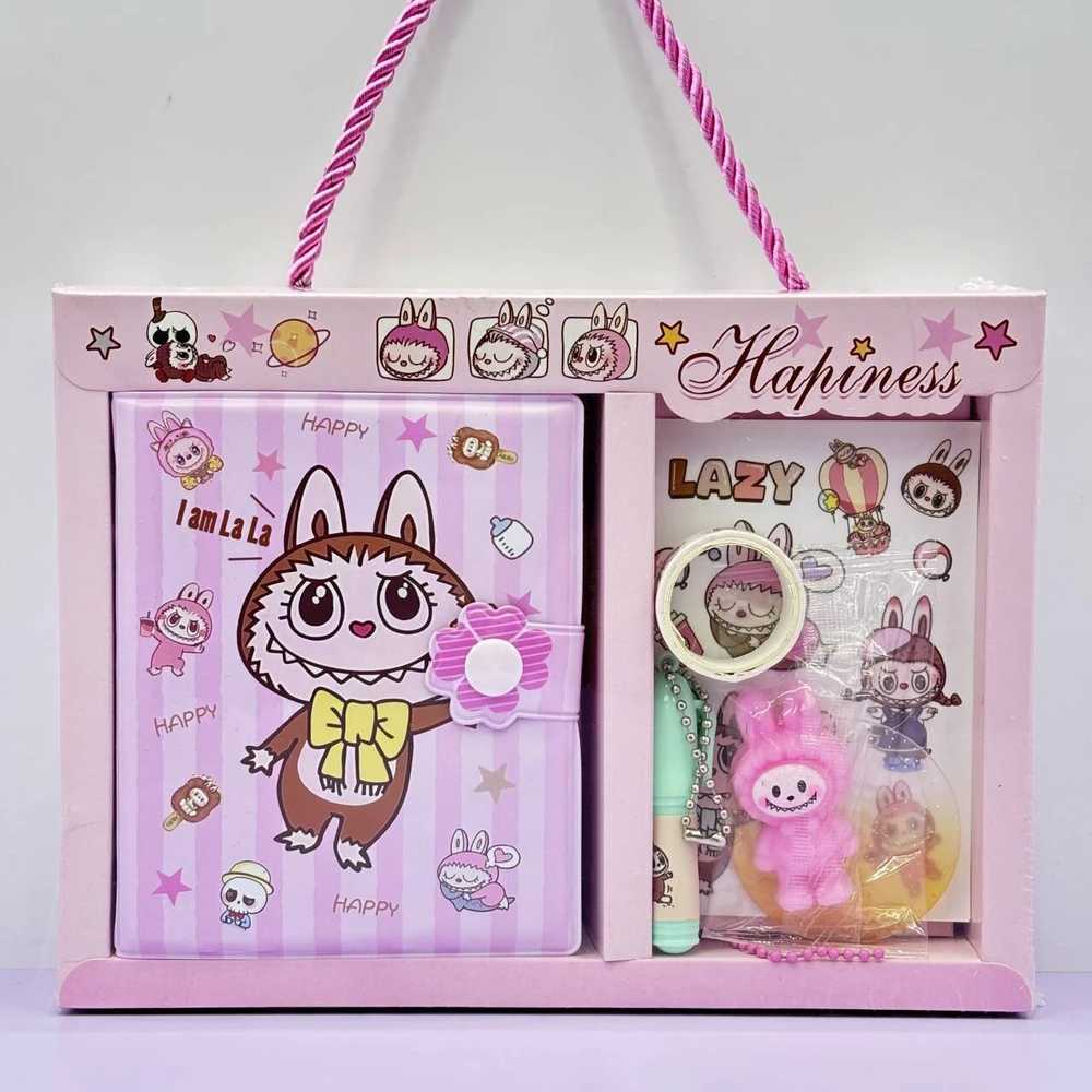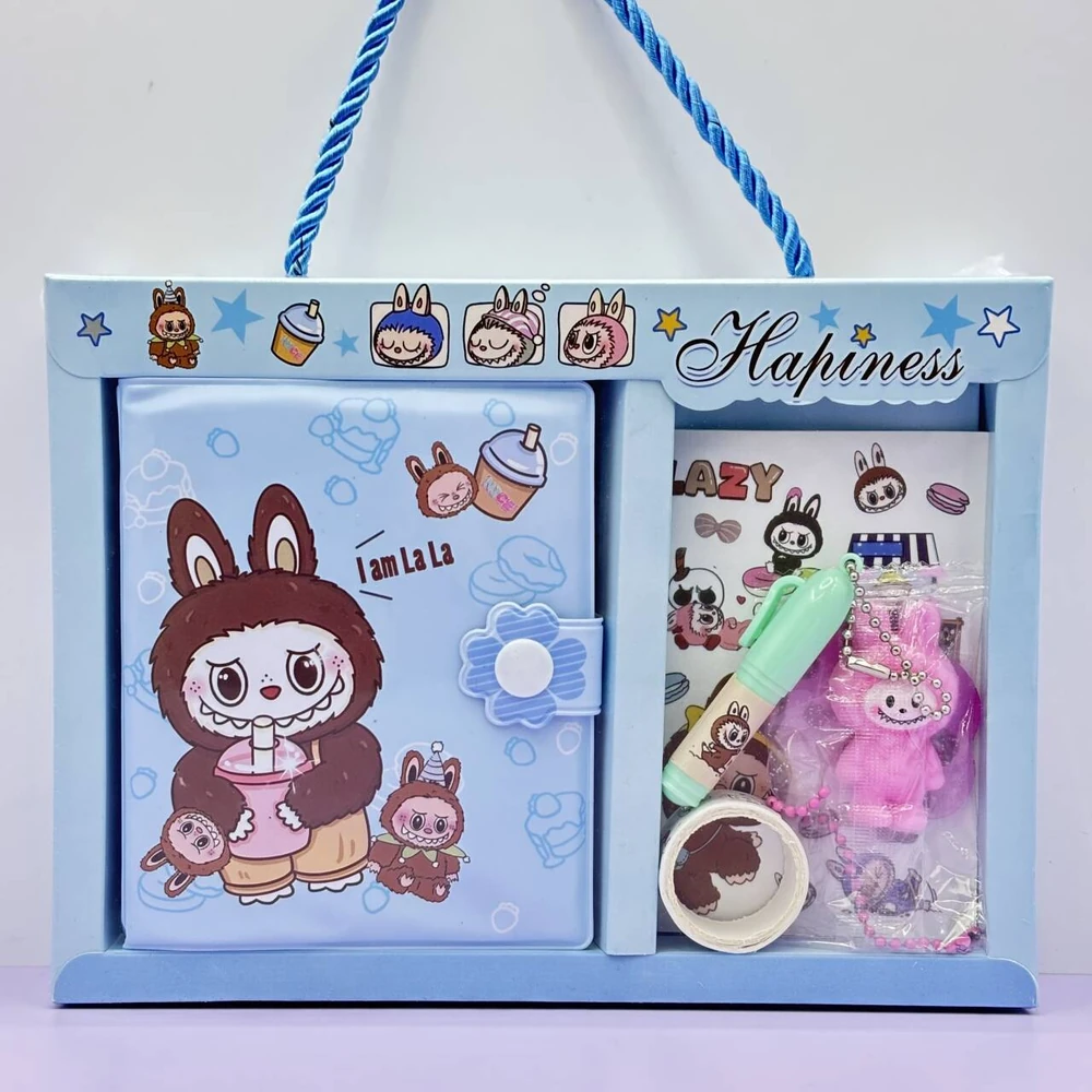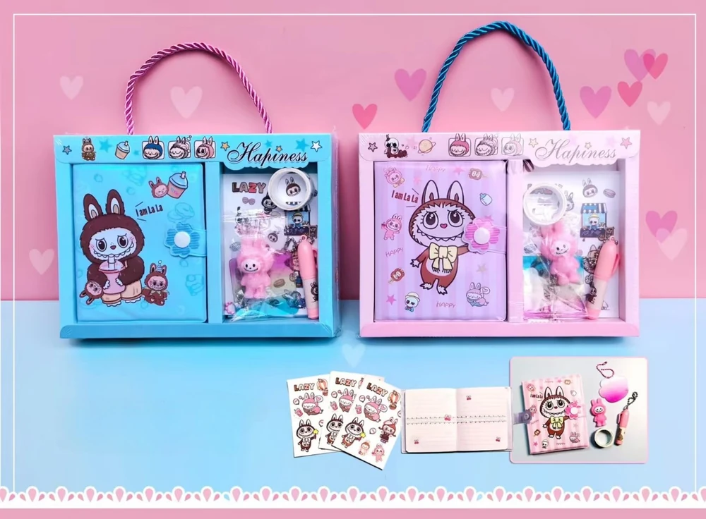 (Set de cuaderno + figura de labubu +lapicera +llavero, ideal para llevar a donde mas te guste. Este producto posee 2 modelos diferentes).