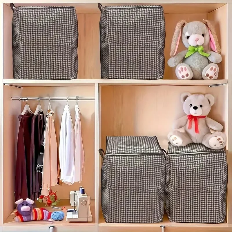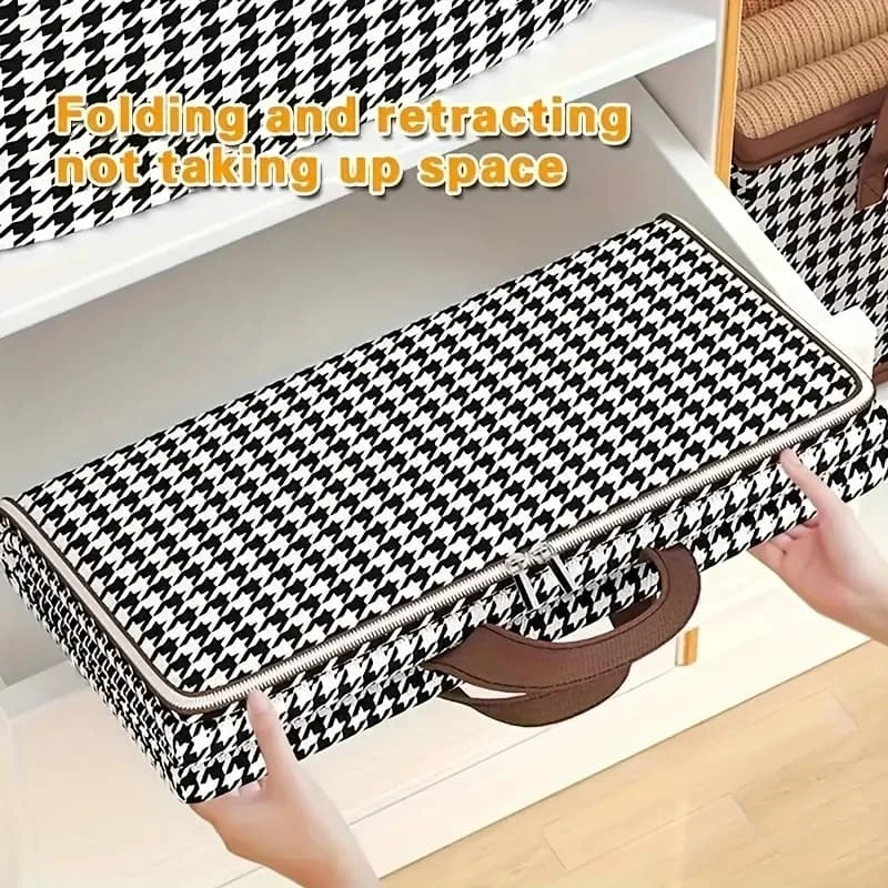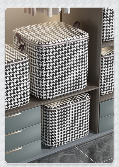 (Canasto de almacenamiento plegable, utilizado para guardar ropa, ropa de cama, o cualquier otro artículo que se desee proteger del polvo y la humedad. Su diseño plegable permite guardarlo fácilmente cuando no está en uso, ahorrando espacio. Además, su cierre asegura que el contenido se mantenga seguro y protegido).