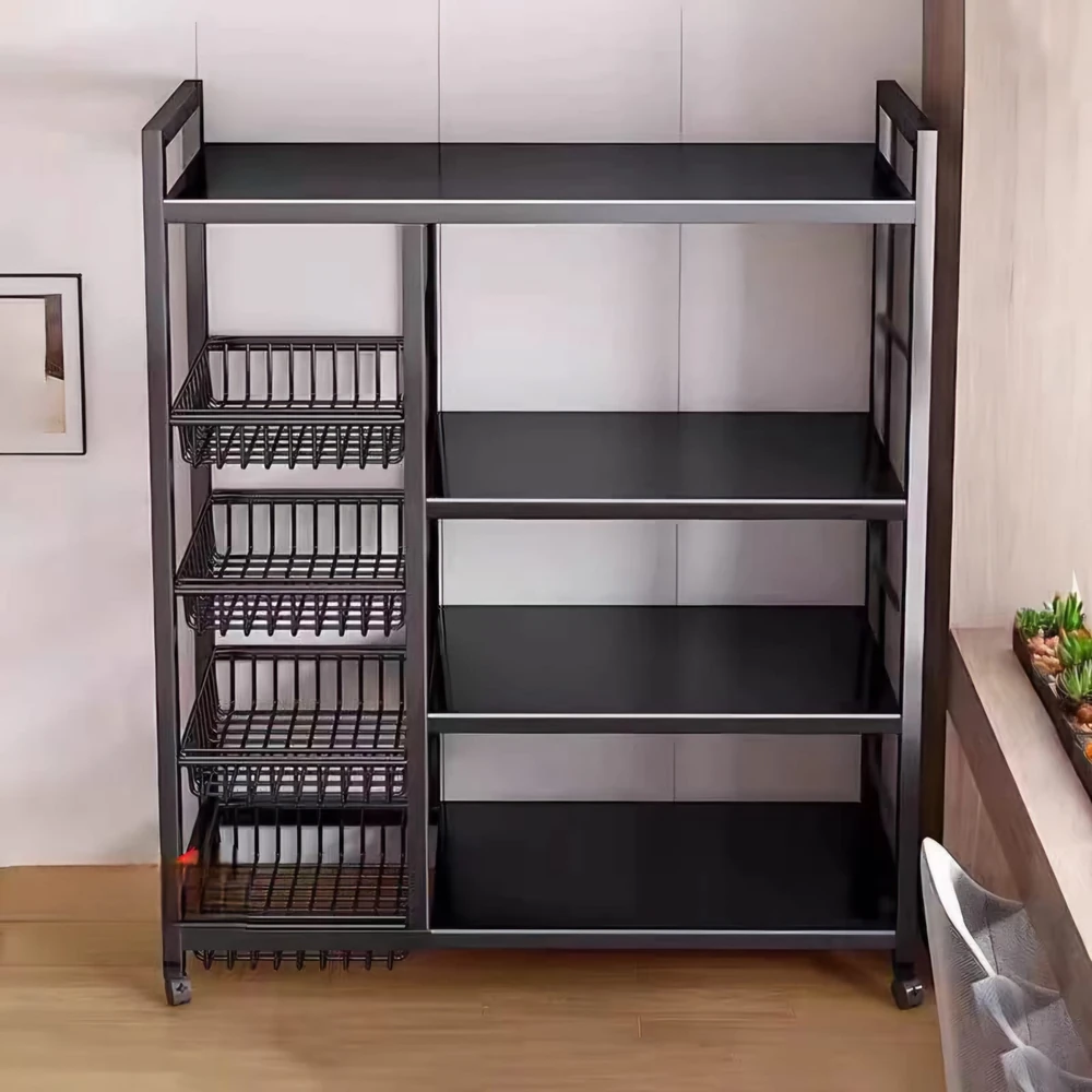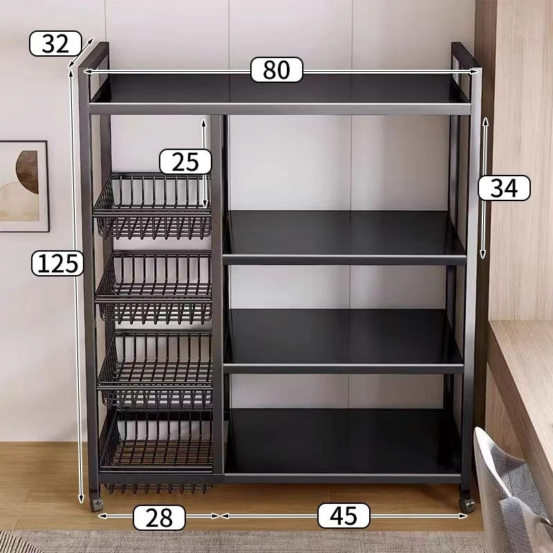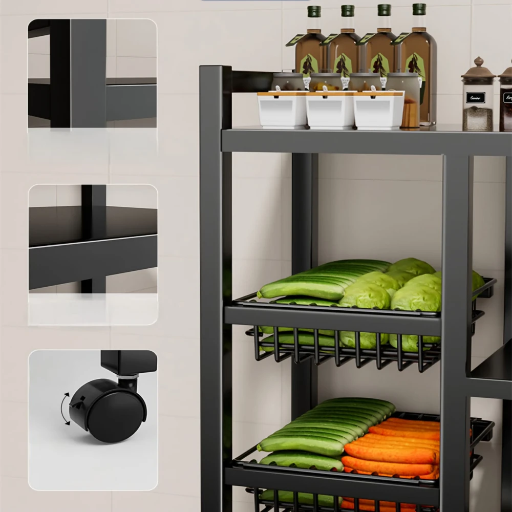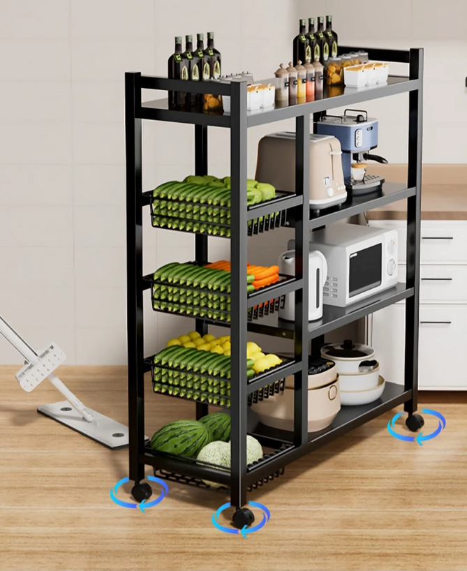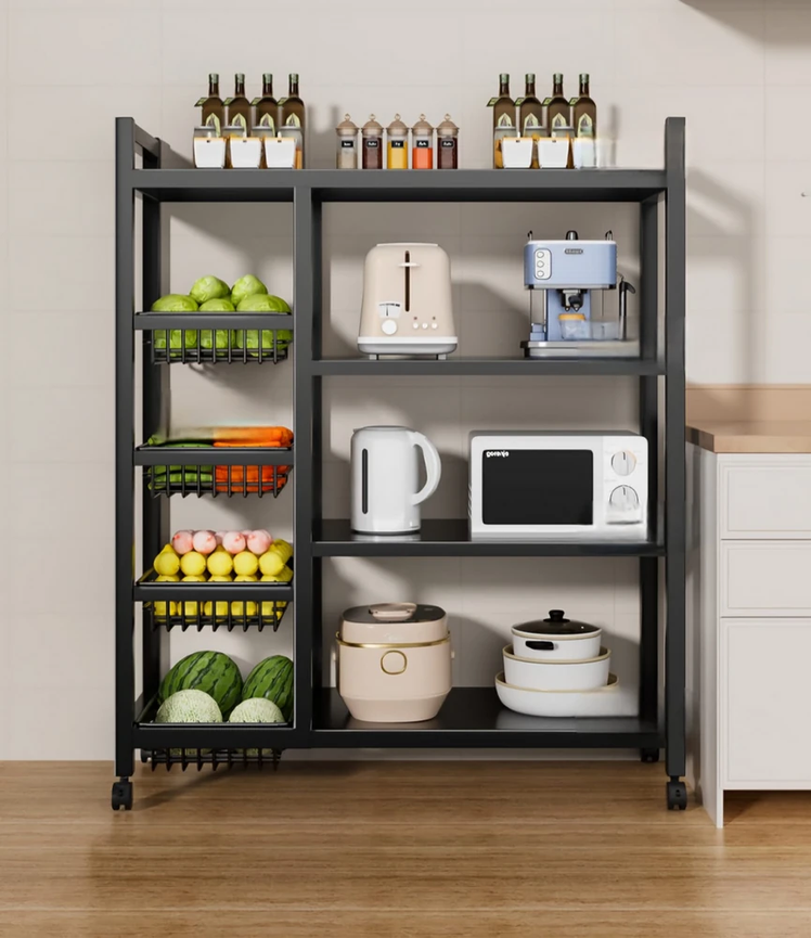 (Carrito o estante de almacenamiento multifuncional de 4 niveles, con ruedas y estantes deslizantes, diseñado principalmente para la cocina. Permite guardar y organizar diversos artículos como utensilios de cocina, electrodomésticos pequeños (microondas, tostadora), alimentos, especias, frutas y verduras en sus cestas desmontable. Aprovecha el espacio vertical y puede ubicarse en espacios reducidos o rincones, ayudando a mantener el orden y reducir el desorden en la cocina o en otras áreas de la casa. Gracias a sus ruedas, se puede mover fácilmente entre diferentes áreas de la casa (cocina, lavandería, baño, etc.), facilitando el acceso a los elementos almacenados y la limpieza del espacio).