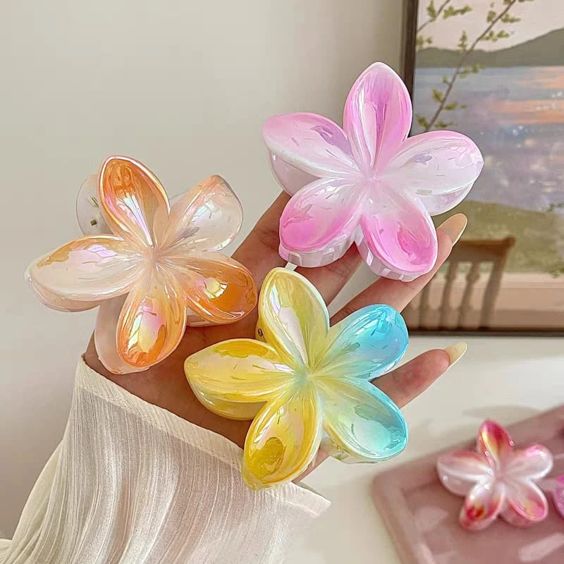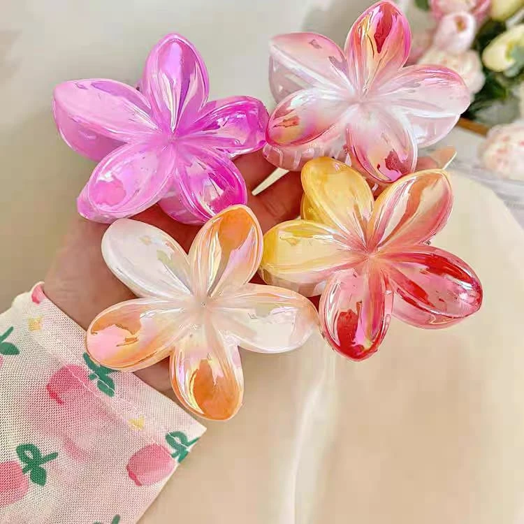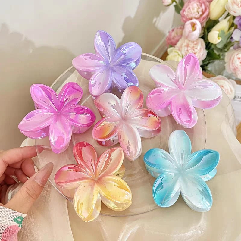 (Broches para el cabello en forma de flor de plumeria hawaiana. Están disponibles por pack de 12U. en varios colores tornasolados, incluyendo naranja, rosa, violeta, celeste, etc. Son un accesorio de moda popular para el cabello).