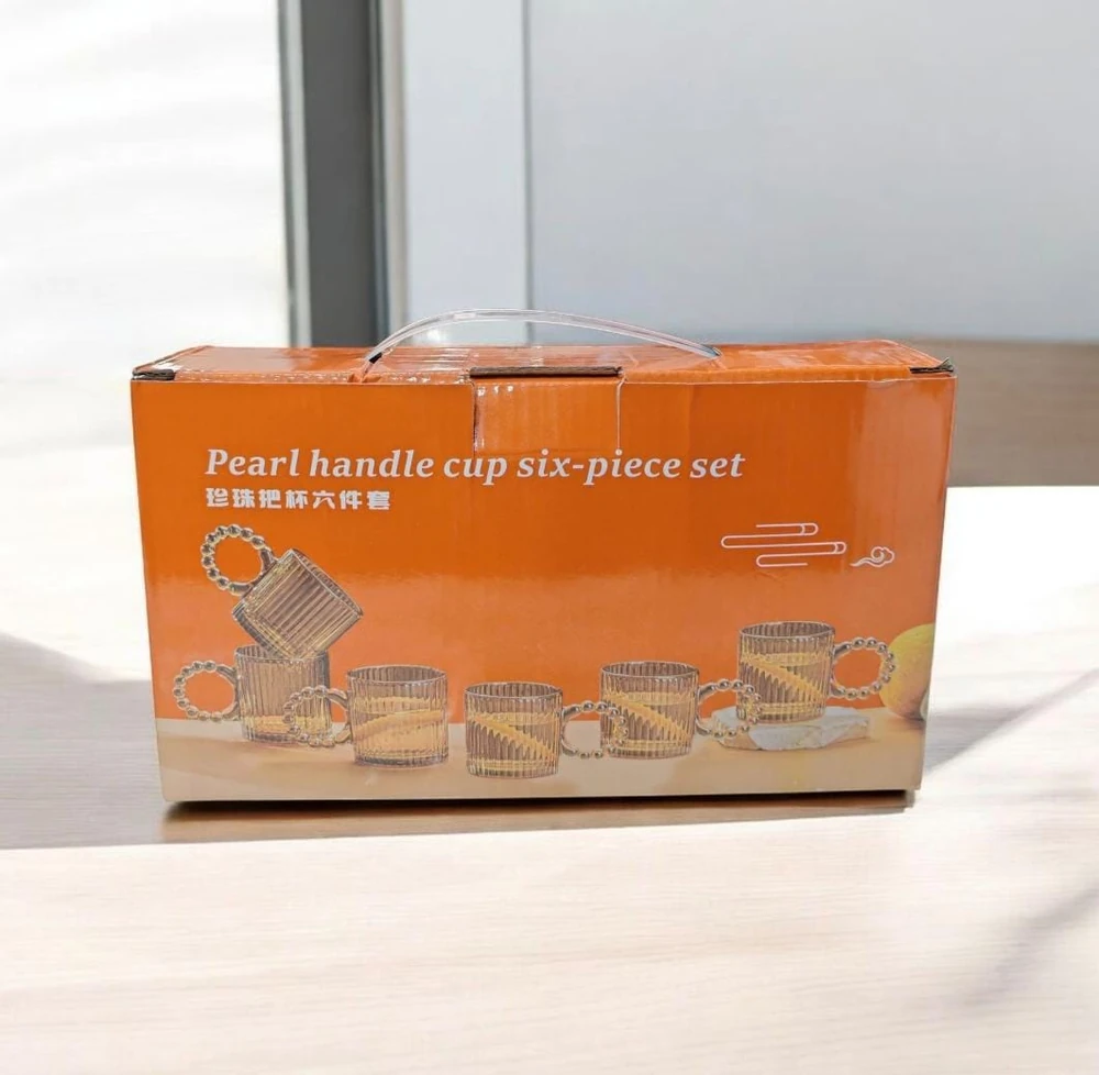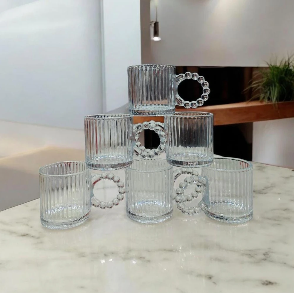 Set de 6 tazas, que tienen un diseño perlado en el mango.