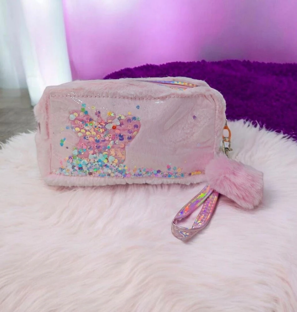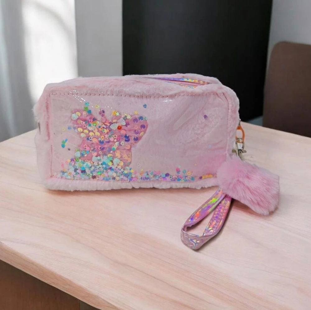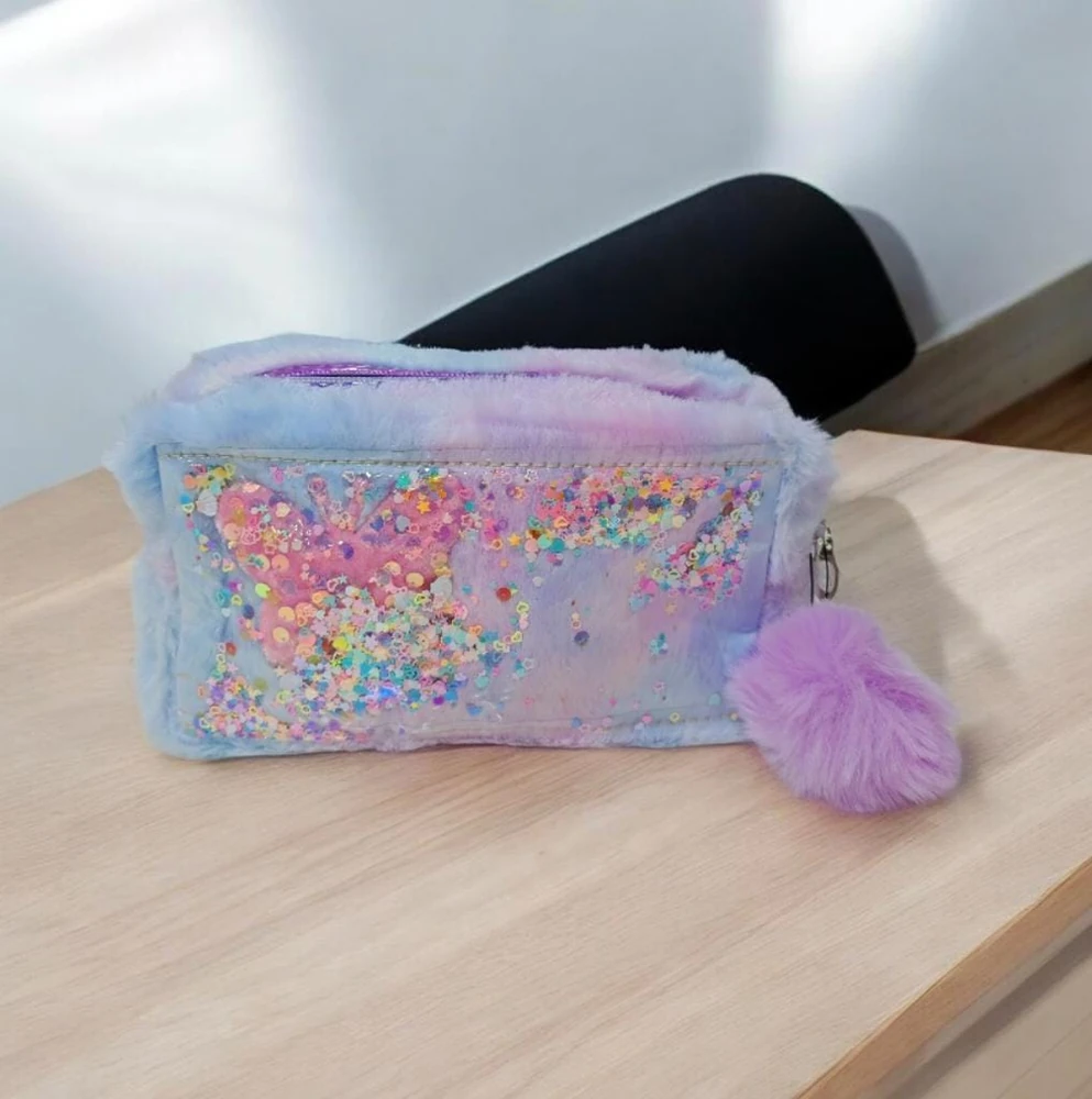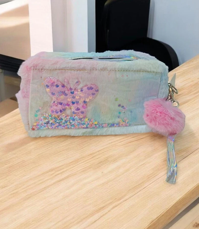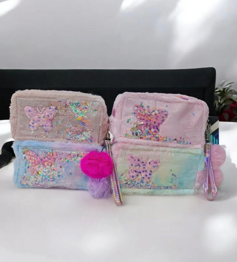 Cartuchera de mariposa. Varios colores en degrade y con brillitos.