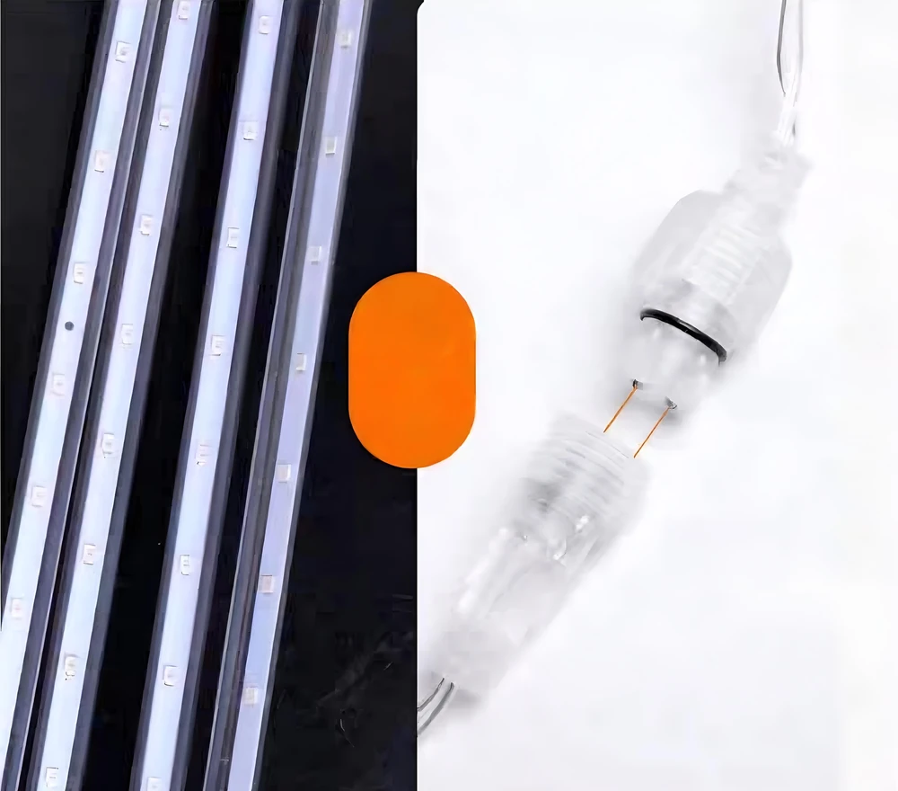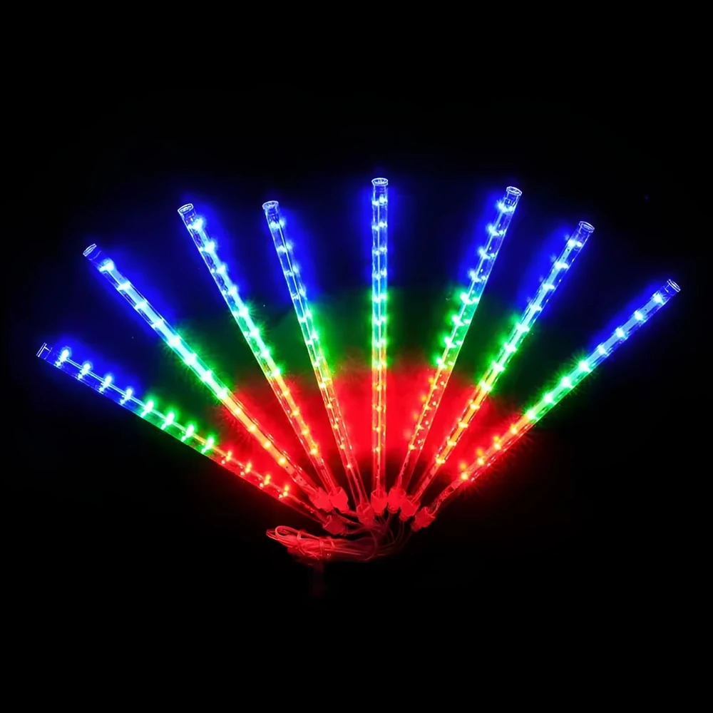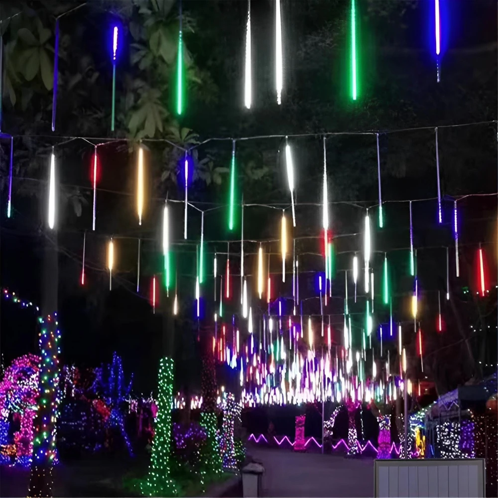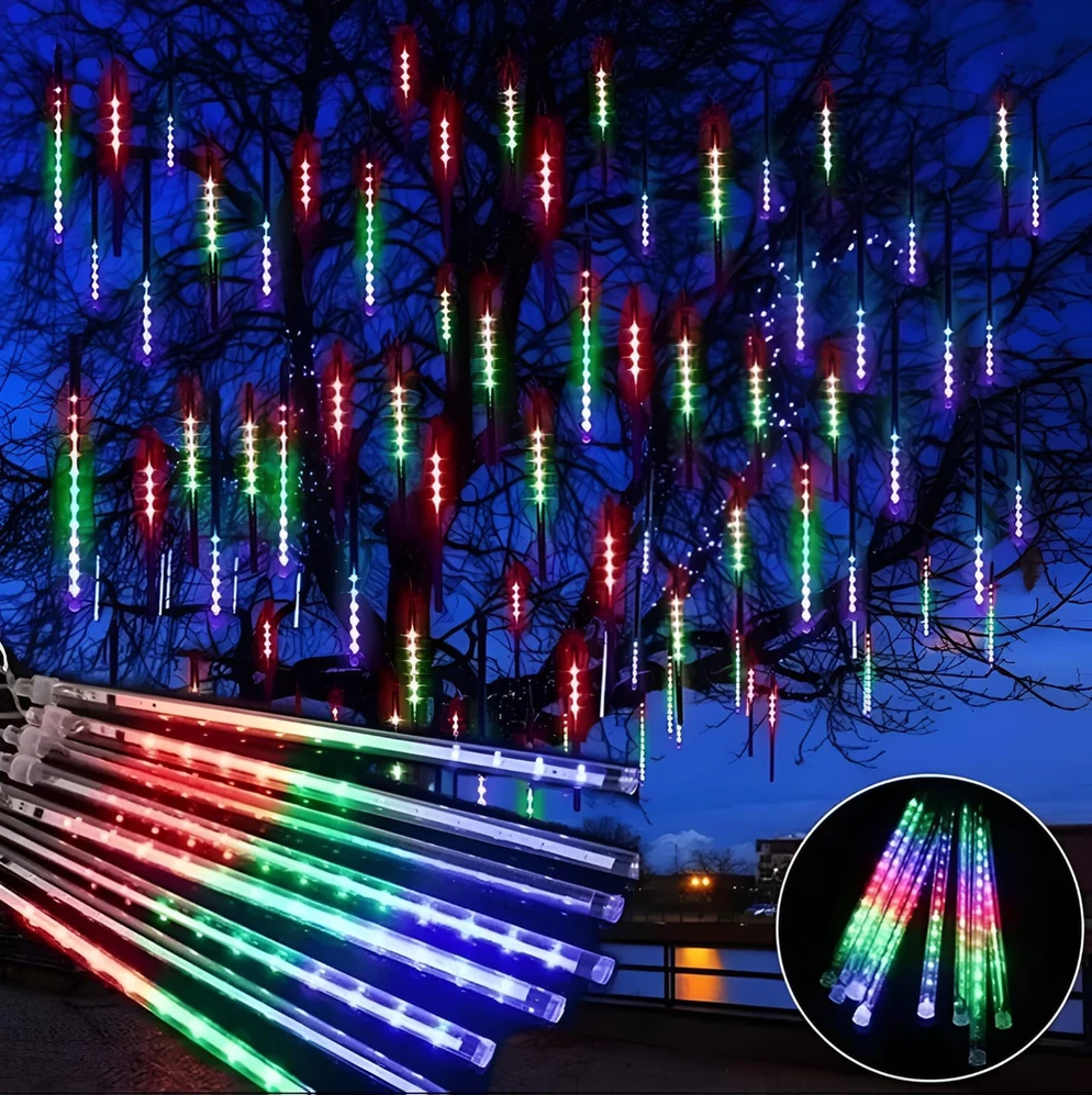 (Luces LED de efecto lluvia de meteoritos. Se utilizan principalmente para la decoración, tanto en interiores como en exteriores, creando un efecto visual similar a la caída de meteoritos o nieve. Son populares para eventos, fiestas, bodas, decoraciones navideñas y para embellecer jardines o patios).