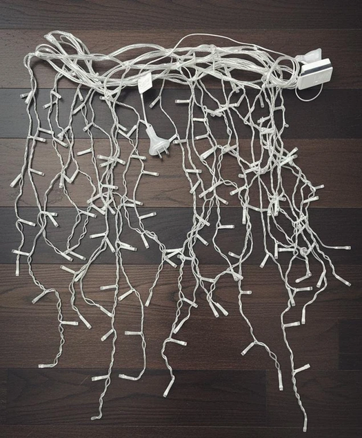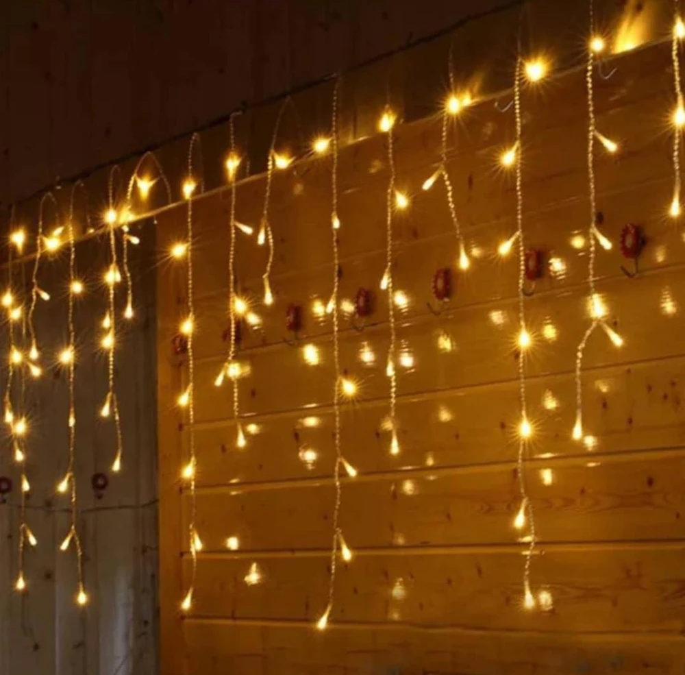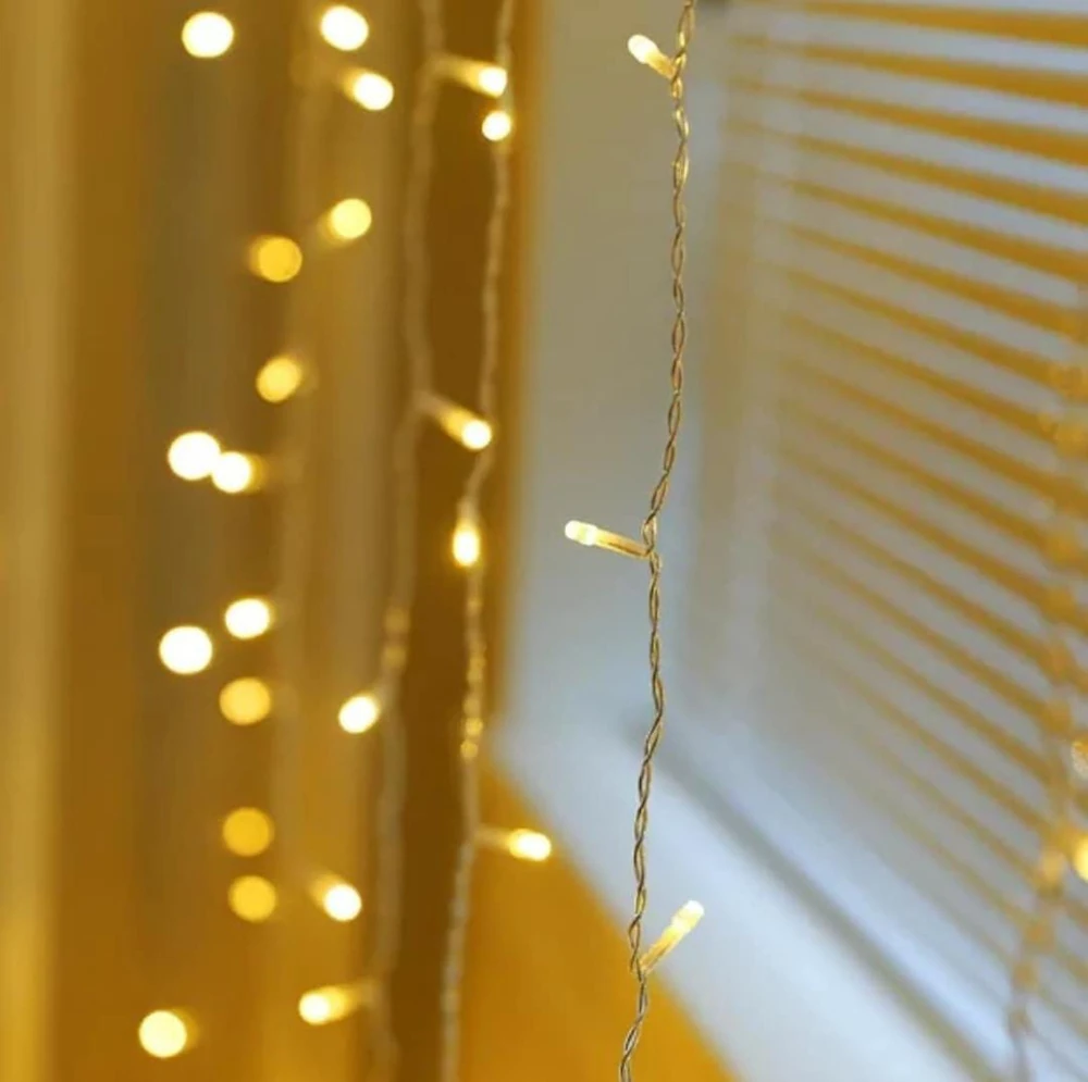 (Cortina de 165 luces LED Cálida, ideales para decorar, tiene 1.5 metros de largo lo que genera un efecto visual similar a una cortina.Cuentan con diferentes modos de iluminación, como destellos o transiciones suaves, También incluye un alargue).