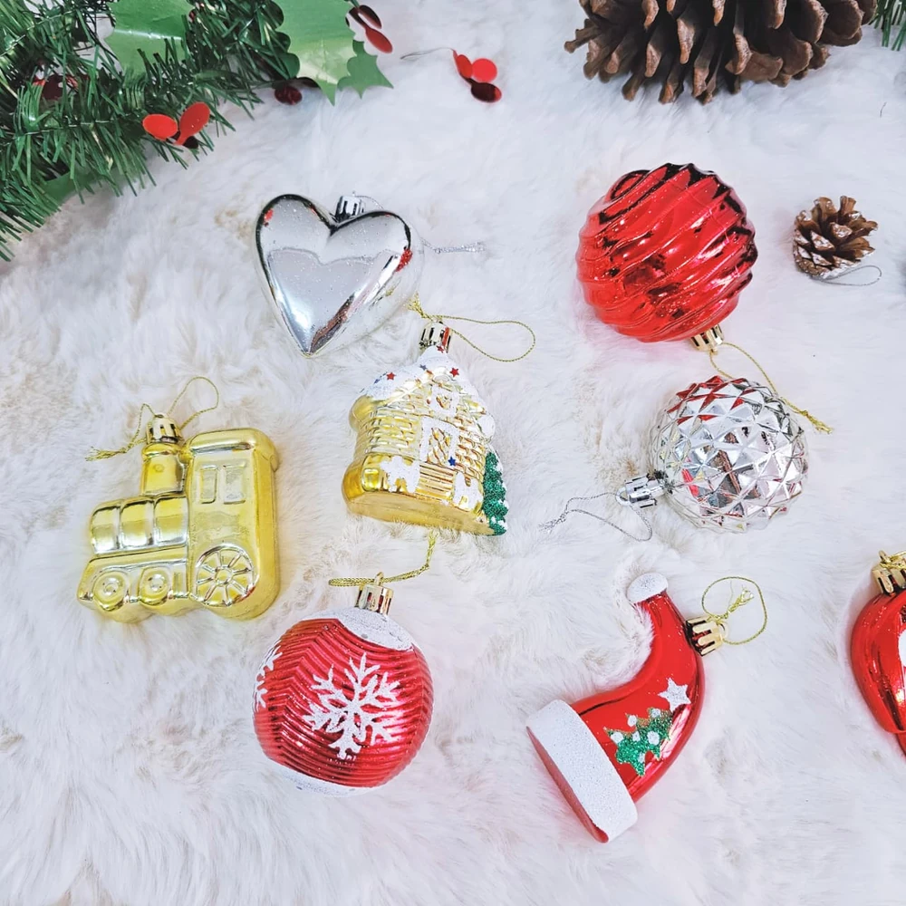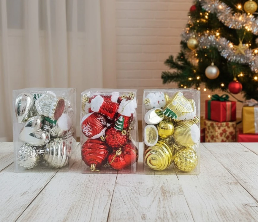 (Cada caja cuenta con 13 Pcs. de adornos navideños como papa noel, campanas y bolas, corazones y estrellas para decorar el árbol de navidad).