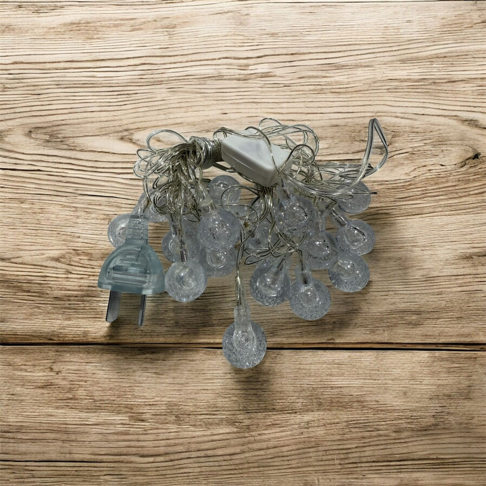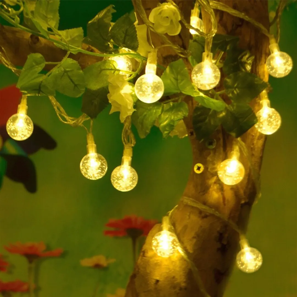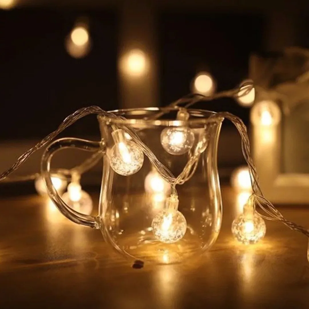 Hermosa Guirnalda Decorativa led conformada por 28 Mini Bolitas led Cristal transparentes color Blanco Calido, en una tira de 3 metros de Longitud. Con Cable Transparente. Se conectan directo a 220v. Ideal para decorar Ambientes interiores, para fiestas, Eventos varios, Cumpleaños, o simplemente para darle un toque decorativo y calido a cualquier rincon de tu Hogar.
