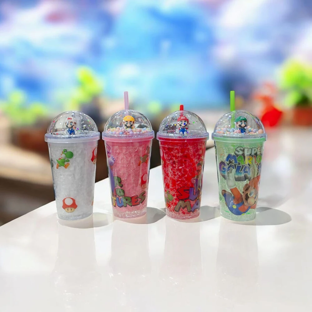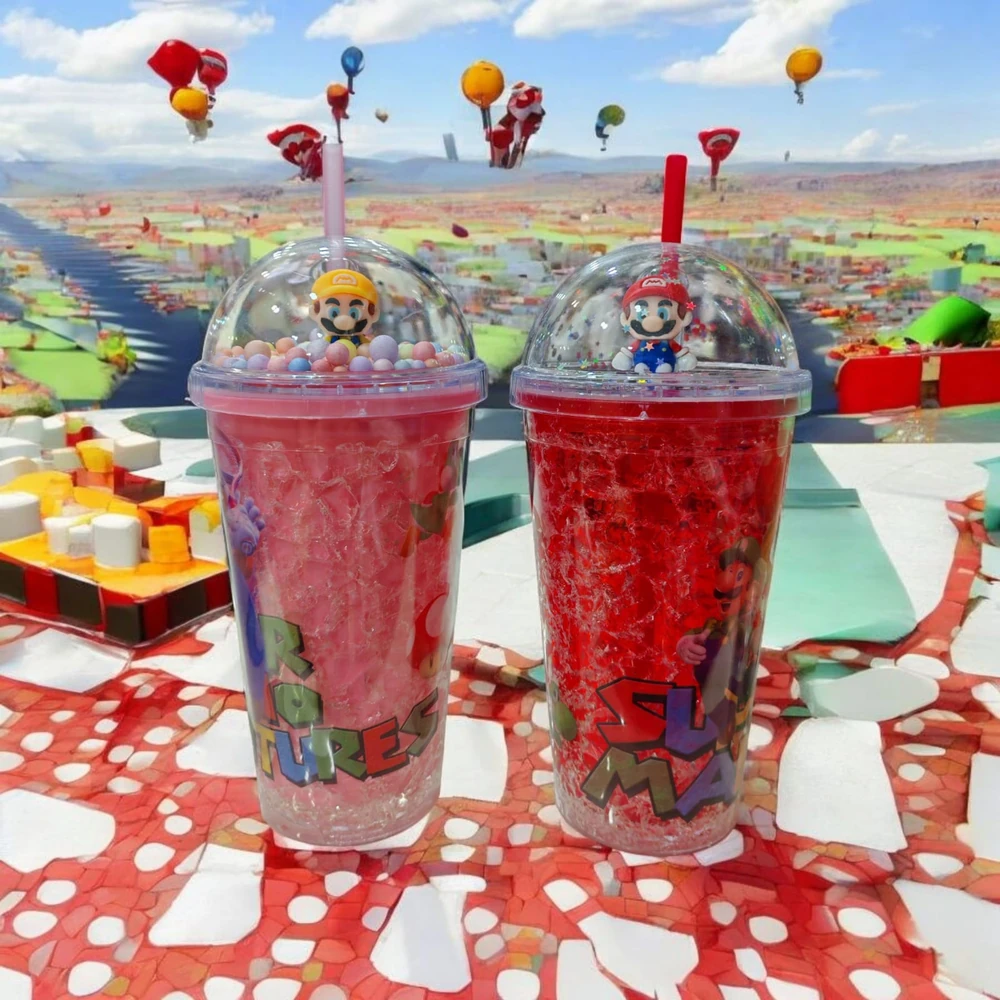 Vaso de super mario, con gelificante que al meterlo al congelador mantiene el frio y dura mas, viene son sorbete y la tapa es a rosca.