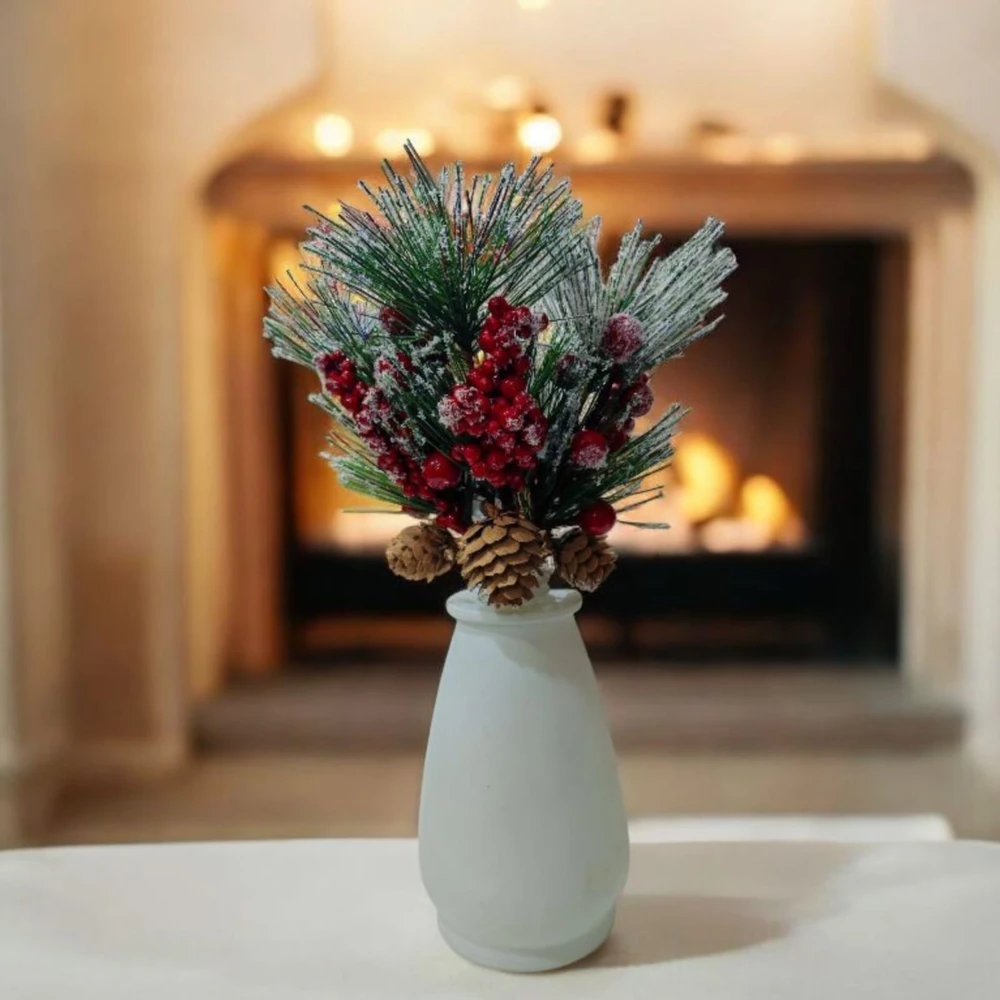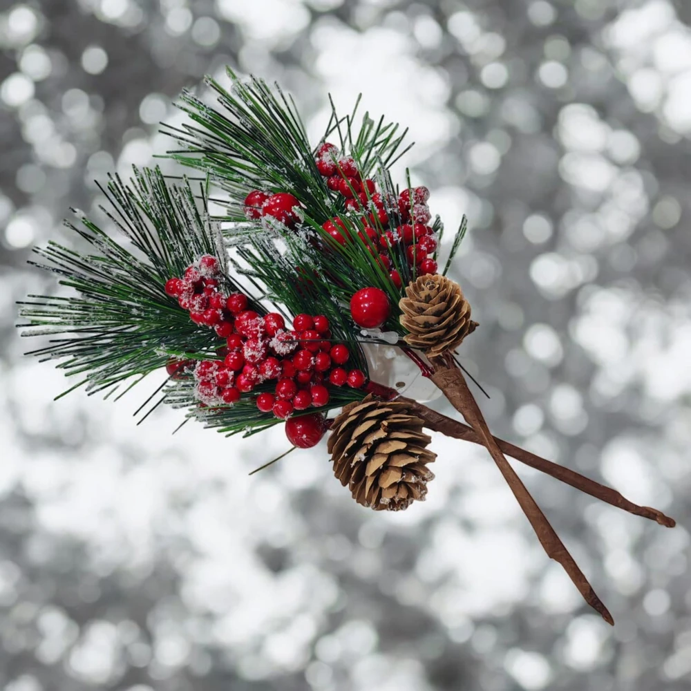 Adorno navideño de muerdago. Es una planta de plastico con bayas rojas y rama de pino cubierta de nieve artificial.