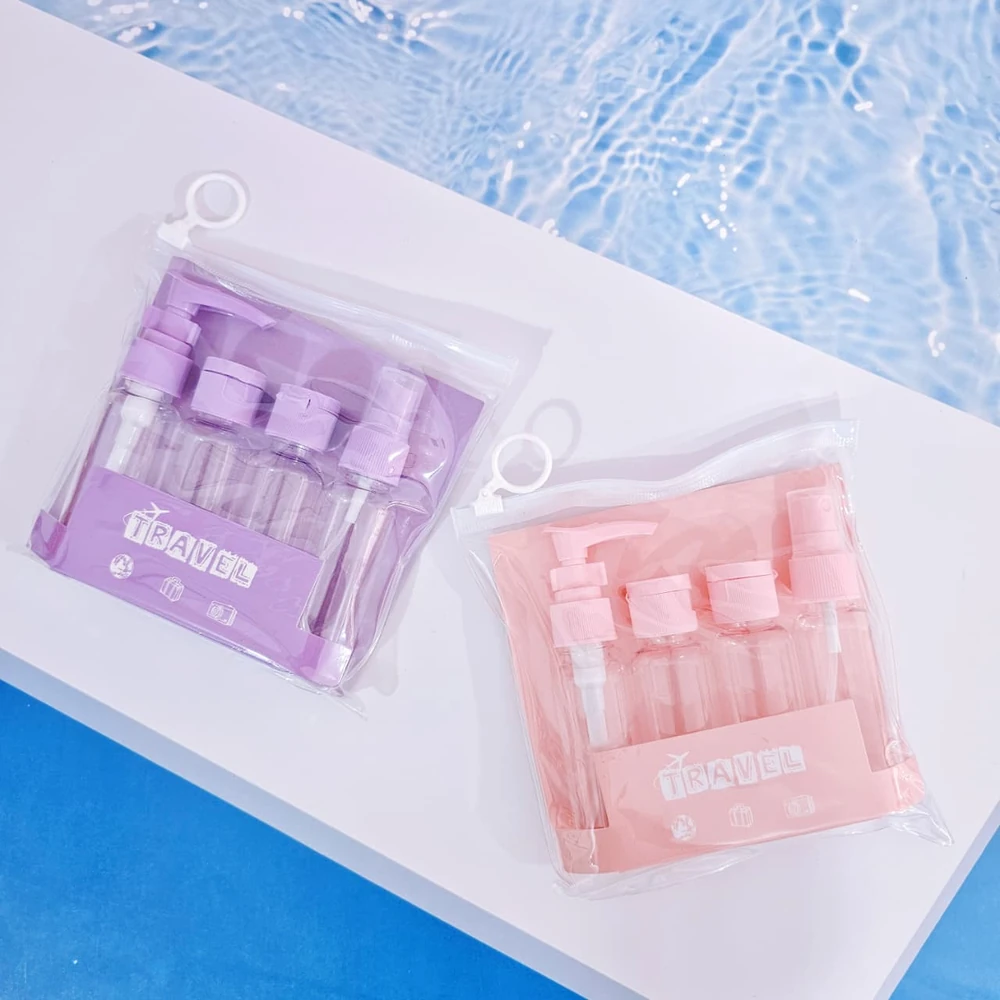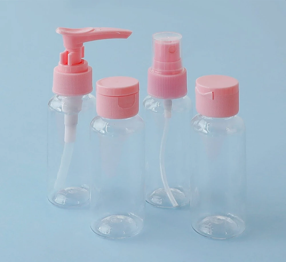 (Set x 4U. Neceser de viaje, que cuenta con 1 dispensador, un rociador y dos envases , ideal para poder sacar el producto fácilmente presionándolo. Son super útiles a la hora de llevarlos de viaje, ya que por su tamaño no ocupan espacio).