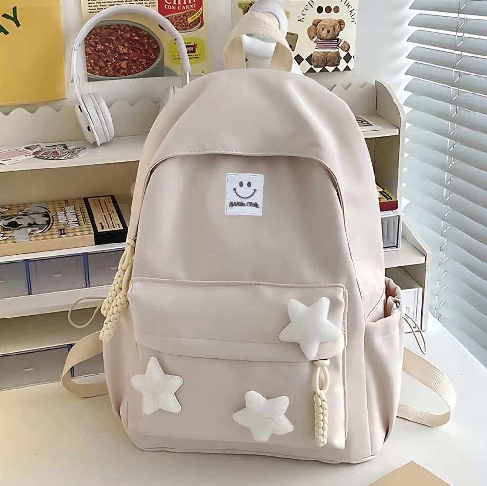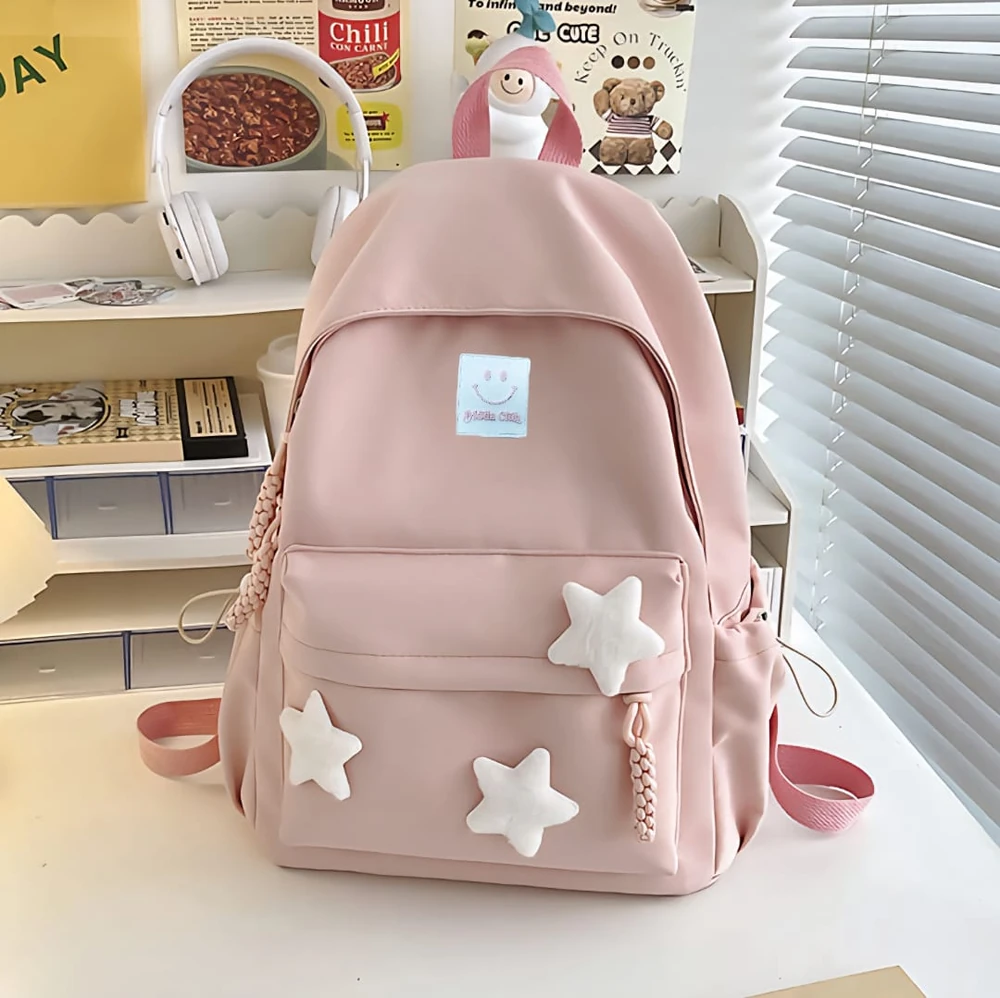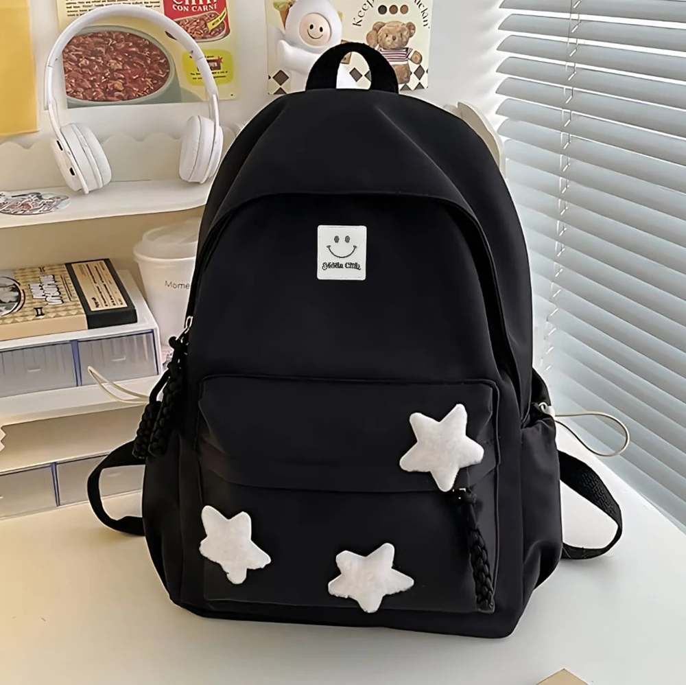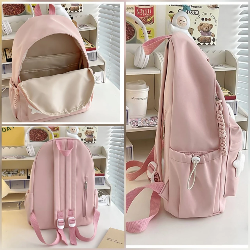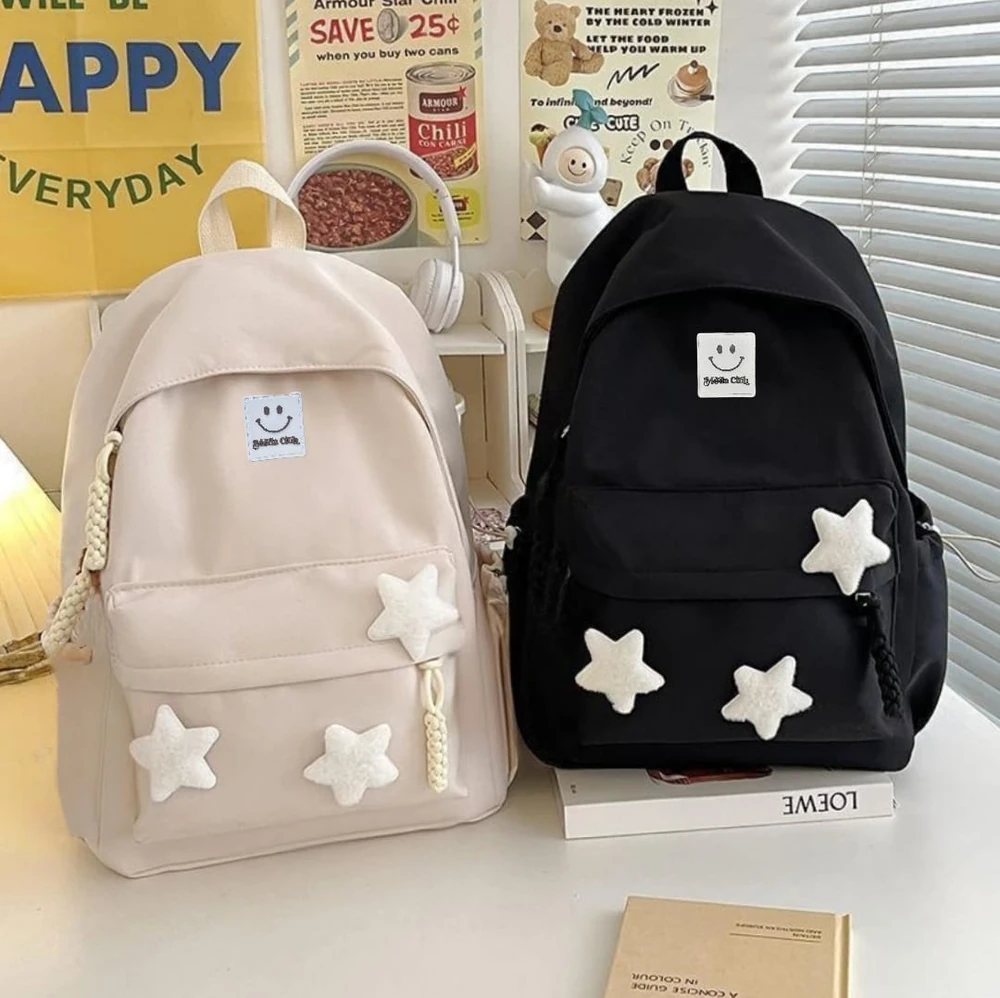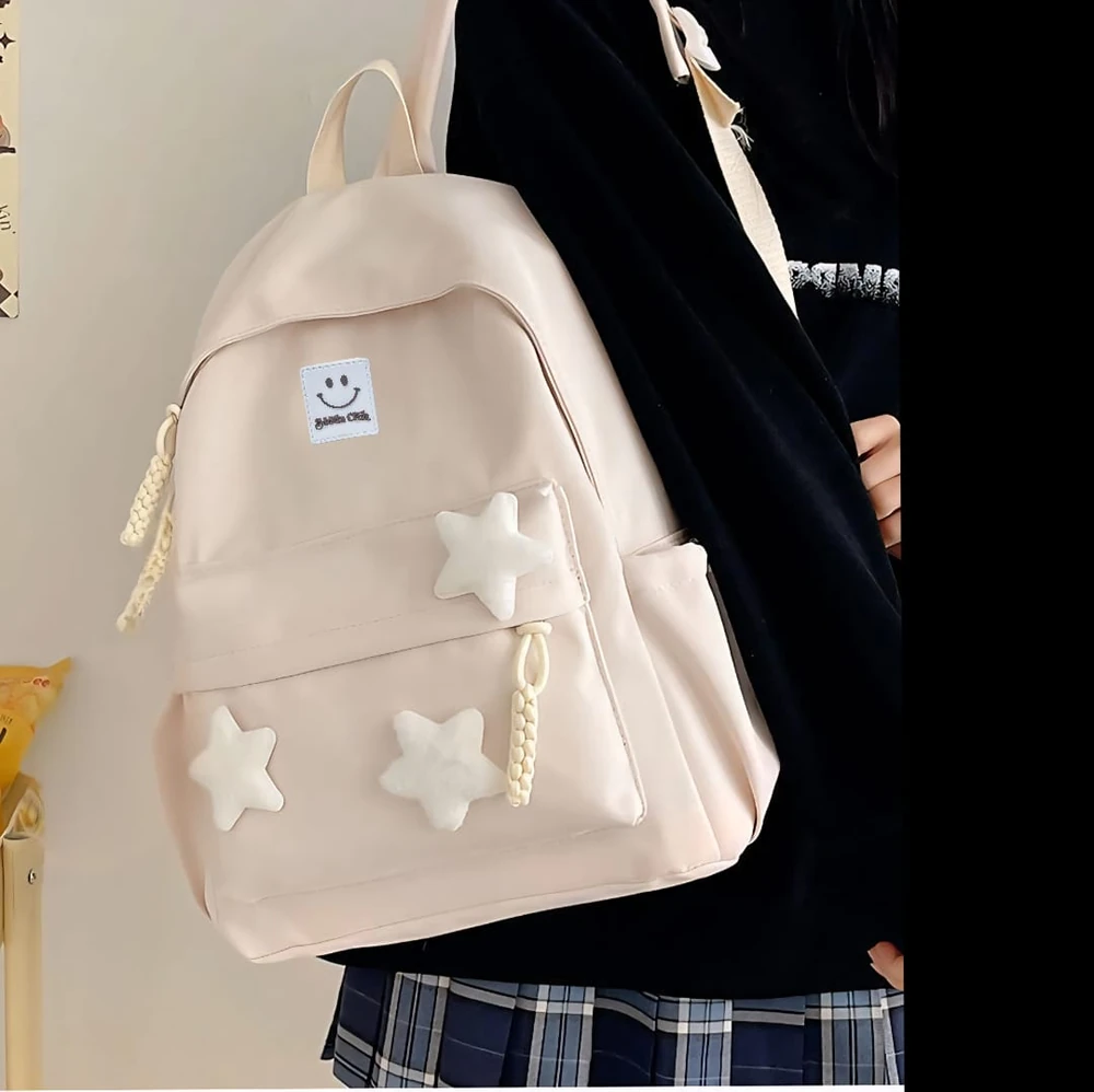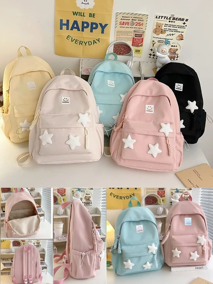 (Mochila escolar o casual, diseñada para llevar libros, útiles escolares, laptops, ropa, botellas de agua y otros objetos personales de forma cómoda y organizada. Dispone de un compartimiento principal con 3 bolsillos internos , 1compartimiento frontal, 2 bolsillos laterales, y un bolsillo trasero. Incluye pins para decorar).