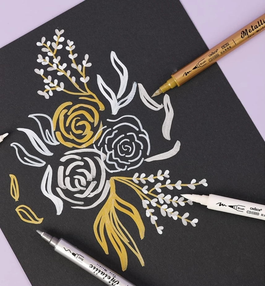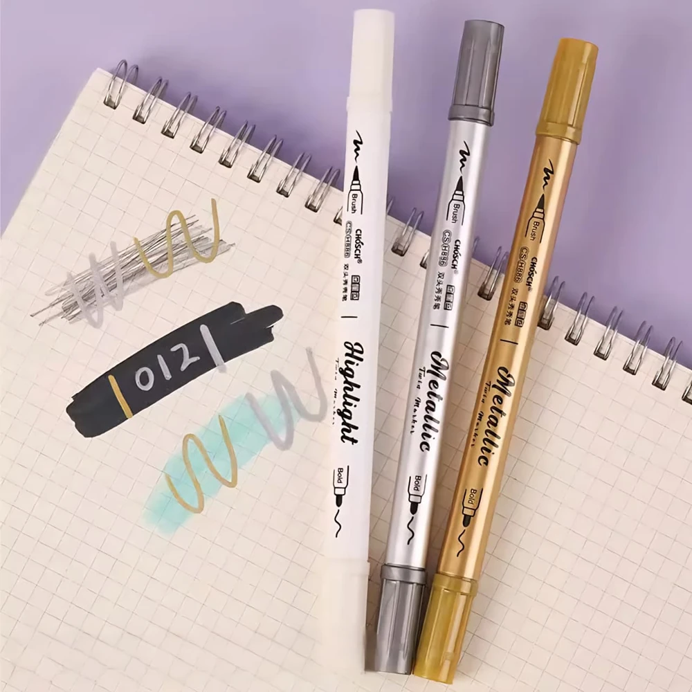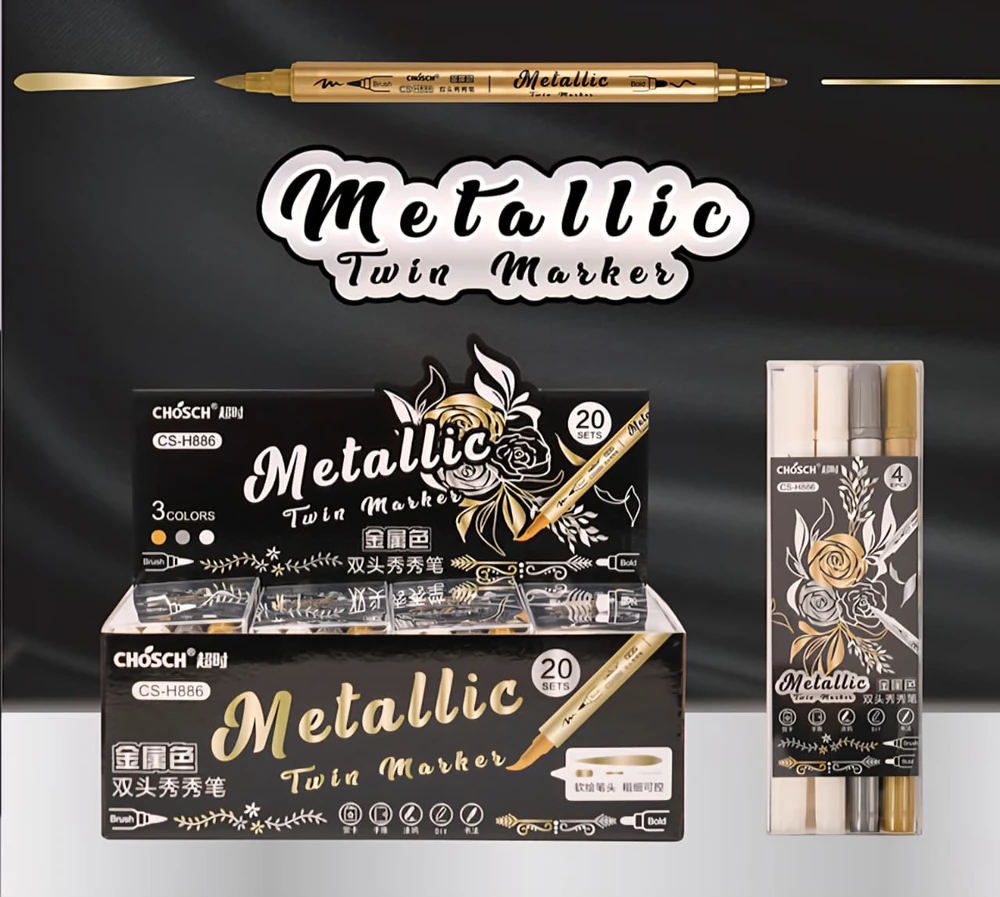 (Set de 4 resaltadores CHOSCH metálicos de doble punta. Estos marcadores son herramientas versátiles para proyectos creativos y artísticos. Tienen una punta fina para detalles precisos y una punta de pincel para trazos más amplios y expresivos. Proporcionan un efecto metálico brillante sobre diversas superficies como papel, cartón, madera, plástico y vidrio. Usos: Son ideales para dibujar, colorear, resaltar, hacer caligrafía y manualidades, dándole a los trabajos una textura metalizada y un acabado vibrante).
