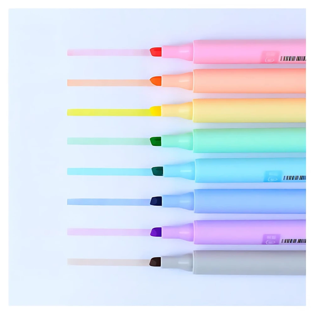 (Set de 8 resaltadores CHOSCH modelo . Ayudan a organizar y categorizar la información visualmente mediante el uso de diferentes colores. Tienen una punta biselada que permite escribir o dibujar con diferentes grosores de línea (entre 1 y 4 mm), lo que los hace versátiles para tomar notas o para proyectos creativos).