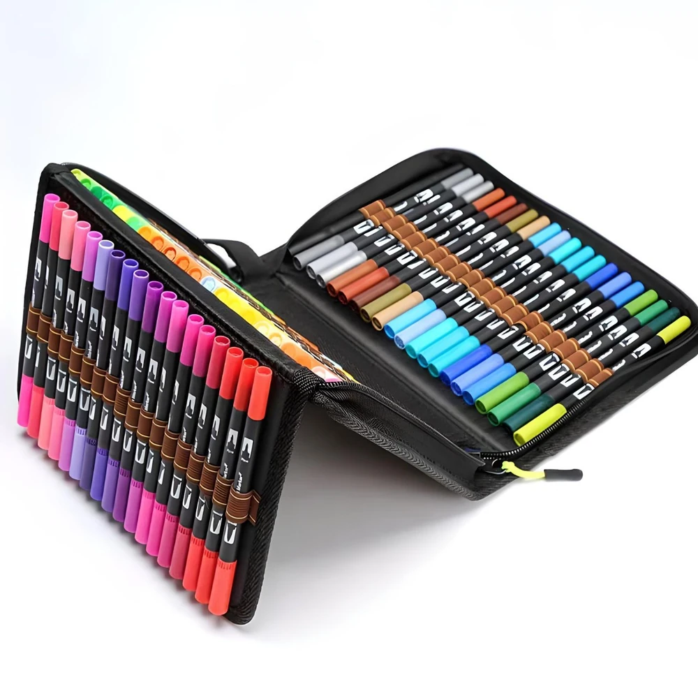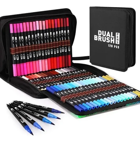 (Marcadores Dual Brush x 120 piezas. Contienen marcadores con doble punta, una es microfibra la otra es punta pincel indeleble ; Incluye estuche organizador práctico, ligero y liviano y una amplia gama de colores que no se repiten).