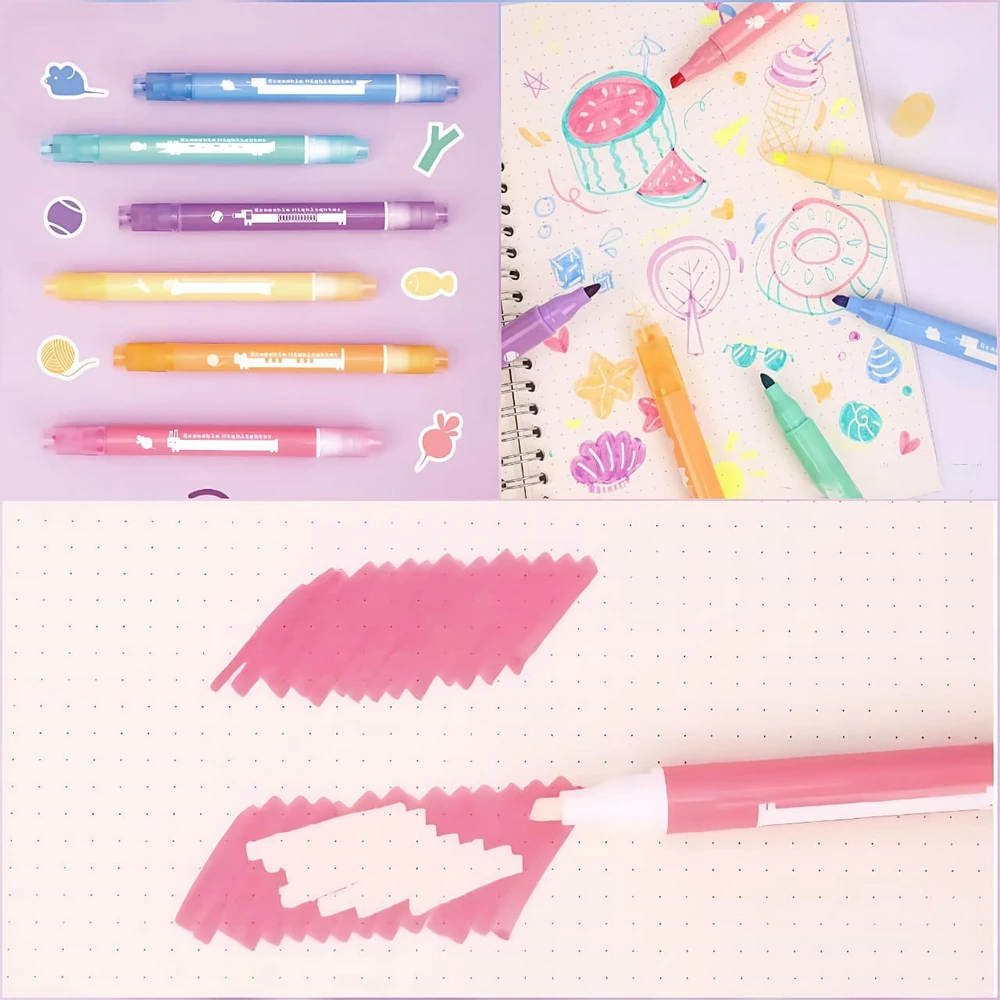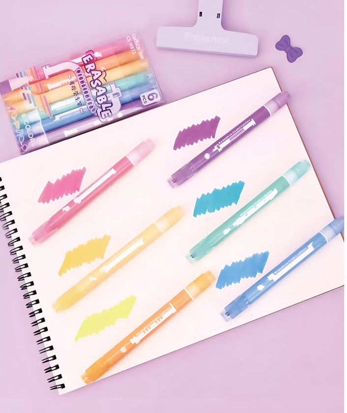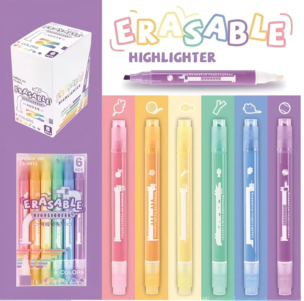 (Set de Resaltador + Borrador, cuenta con 6 colores, tienen una punta de cincel que permite tanto un resaltado amplio como subrayado fino. Son ideales para uso escolar y de oficina).