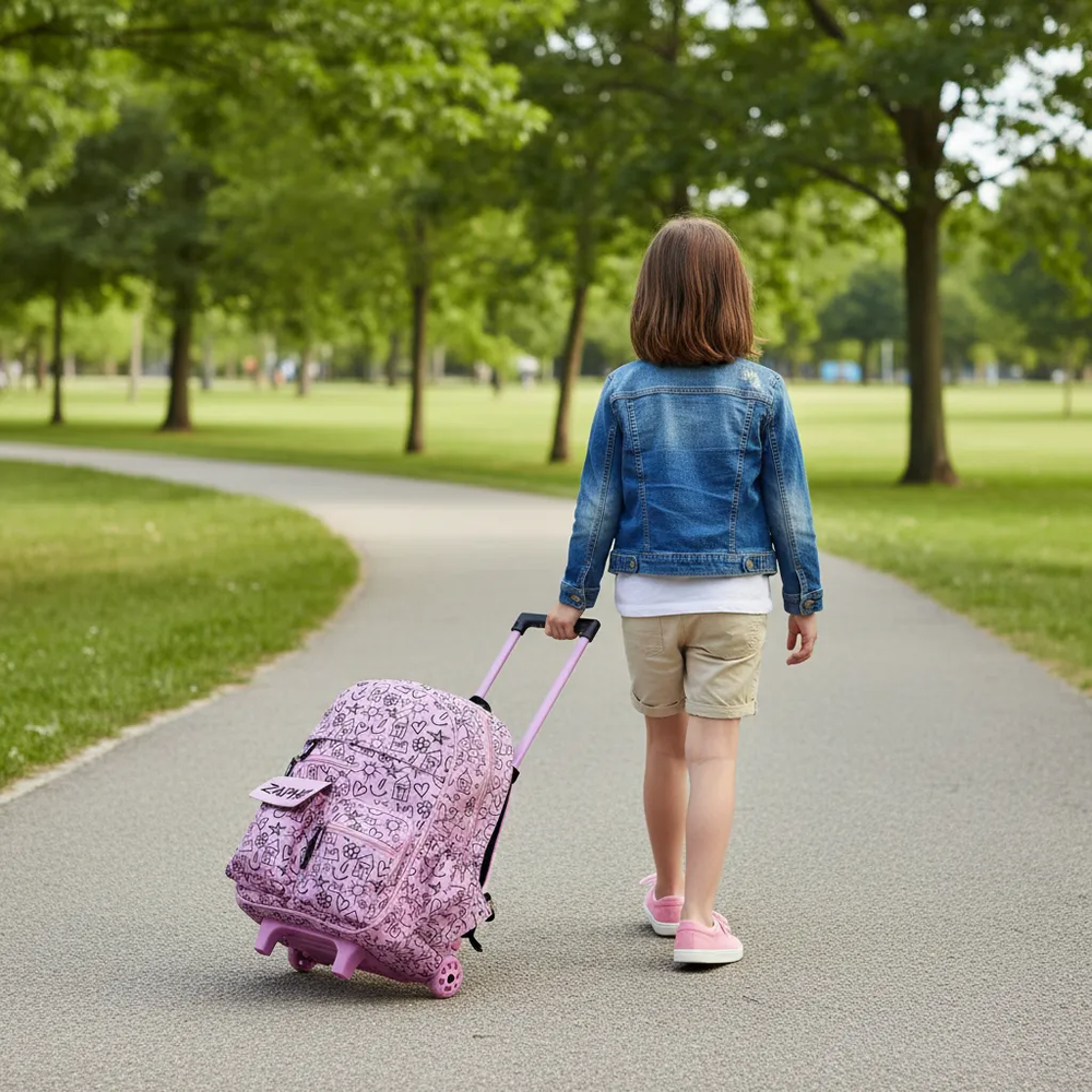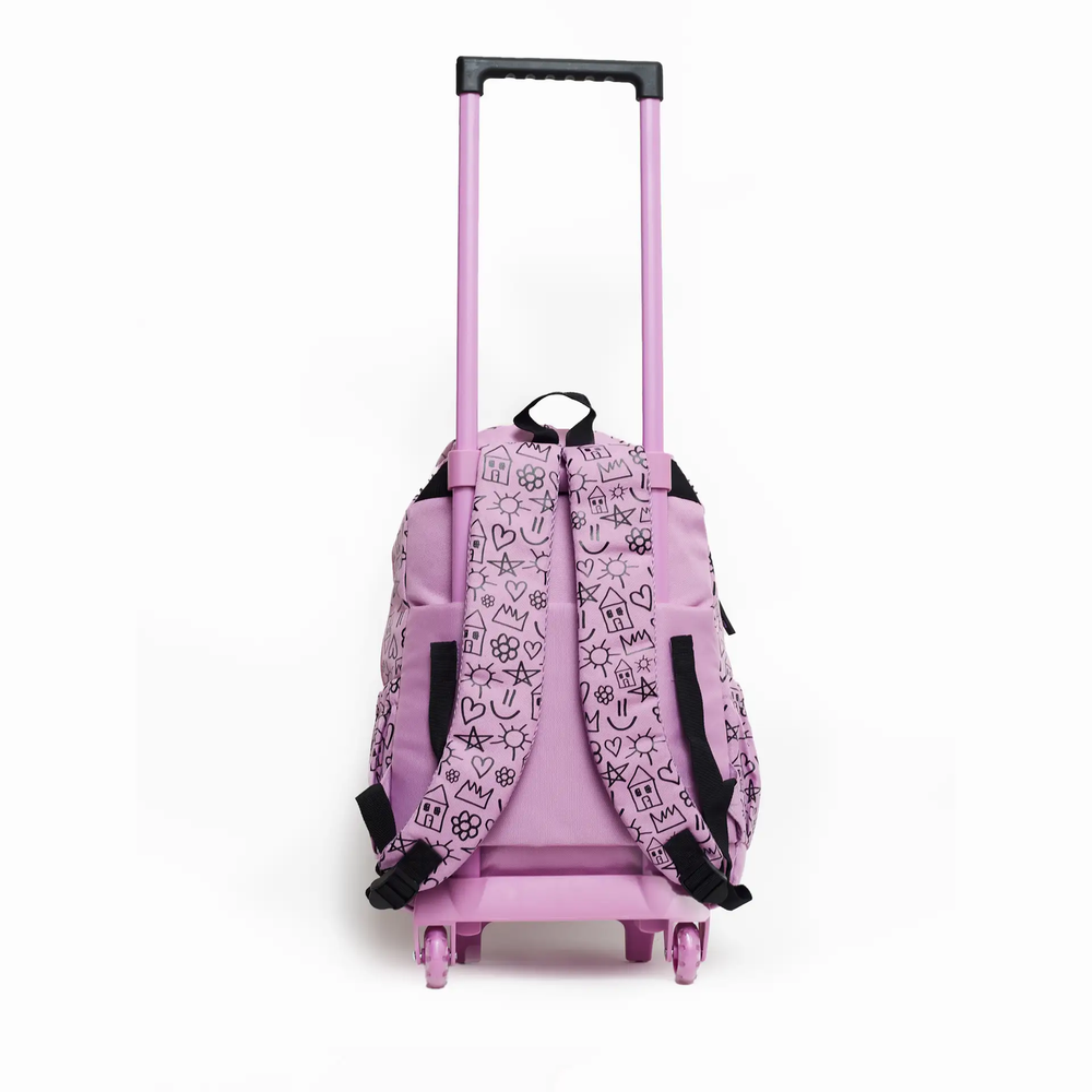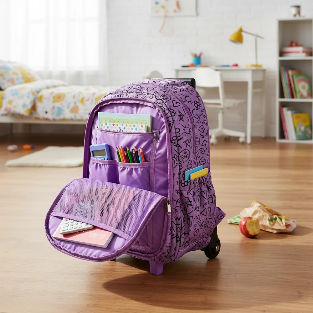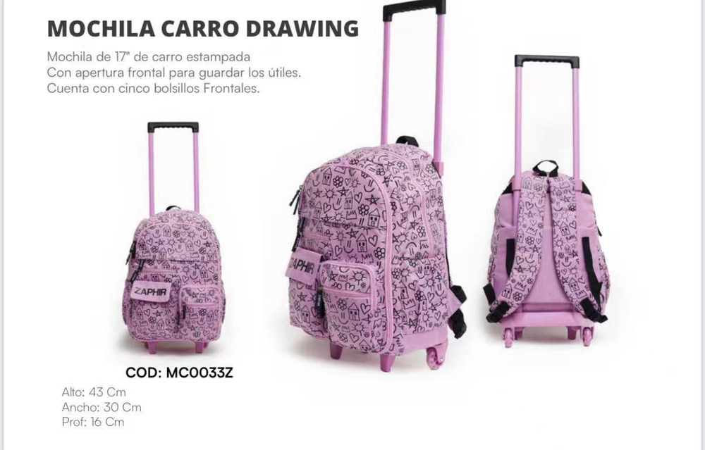 Mochila de 17pulgadas de carrito estampada con apertura frontal para guardar los útiles que cuenta con cinco bolsillos frontales.