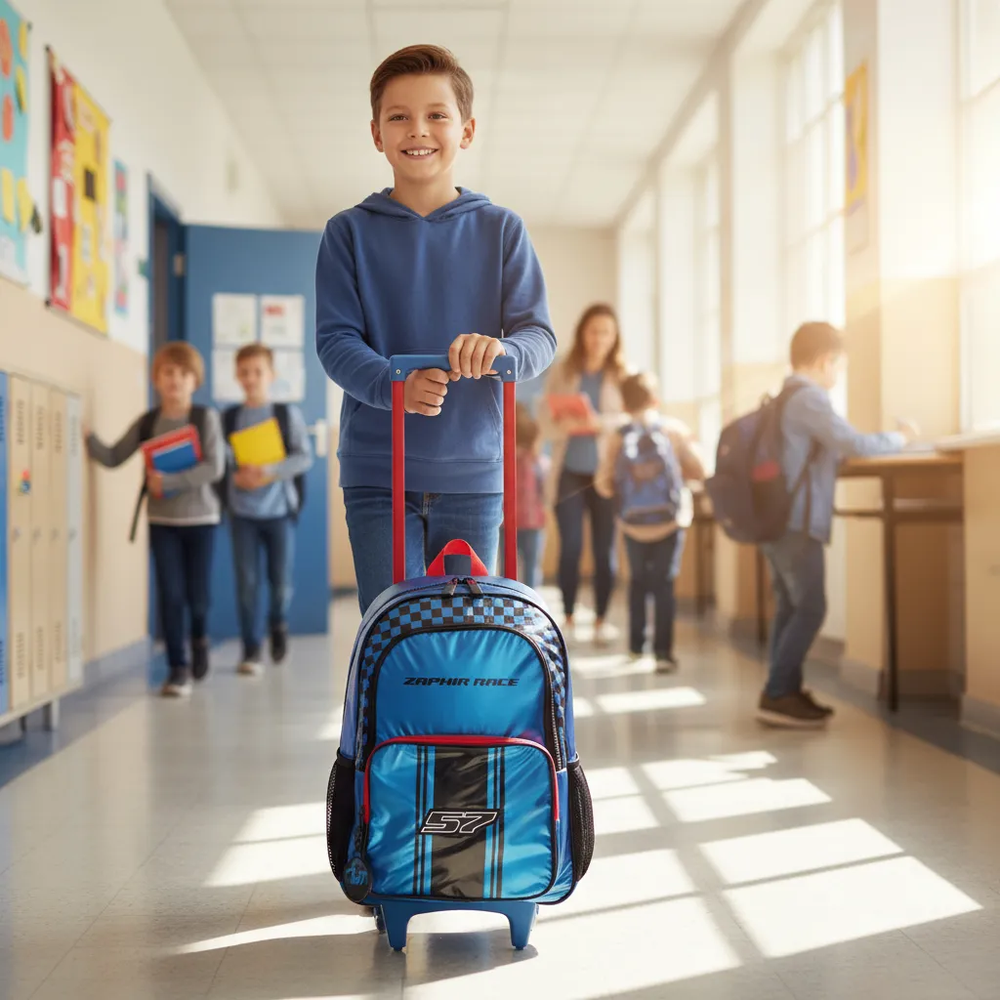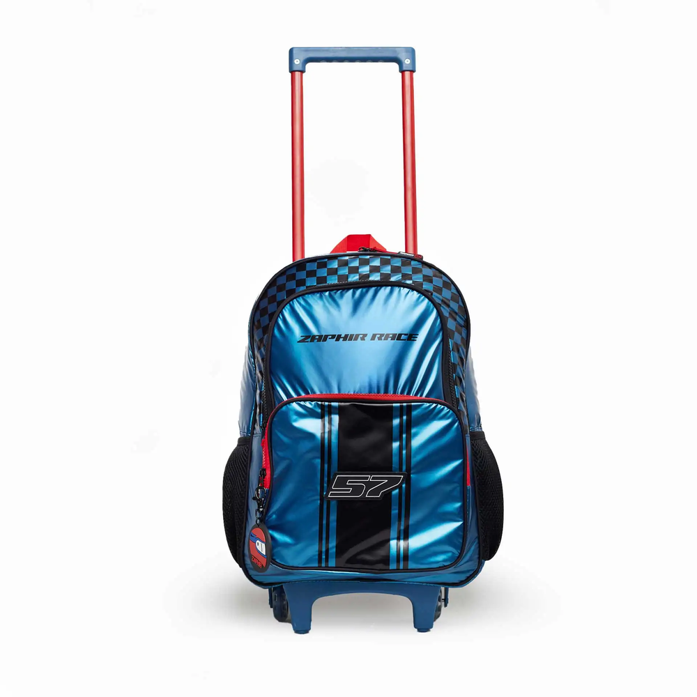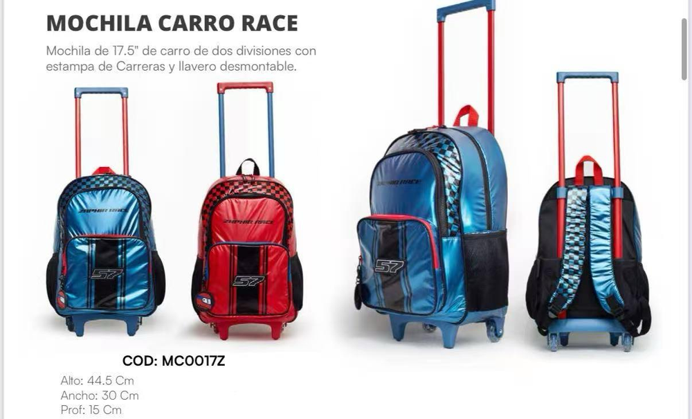 Mochila de 17.5pulgadas de carrito de dos divisiones con estampa de carreras y llavero desmontable.