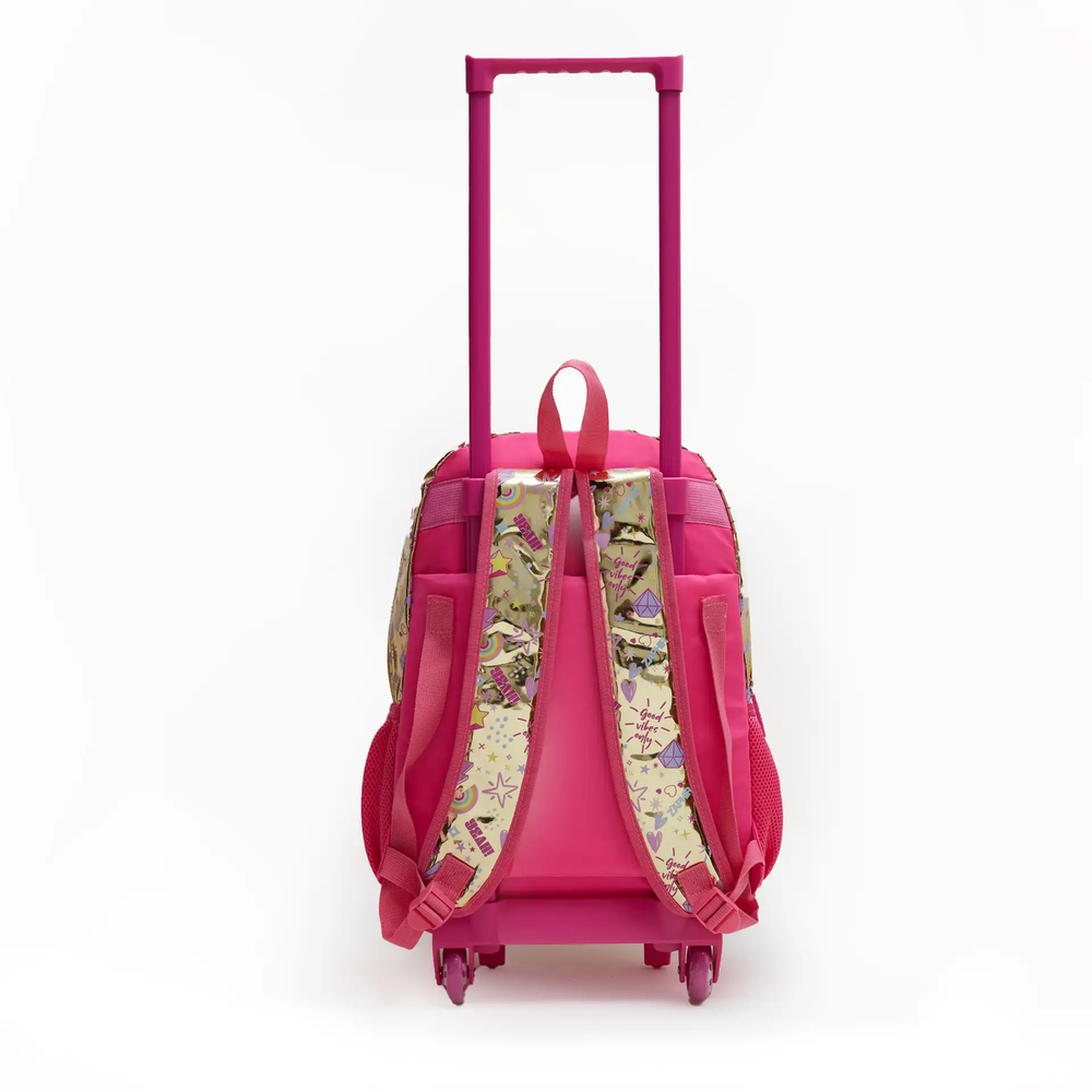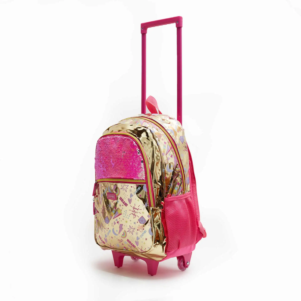 Mochila de 17pulgadas de carrito de dos divisiones estampada con detalles metalizados y lentejuelas.