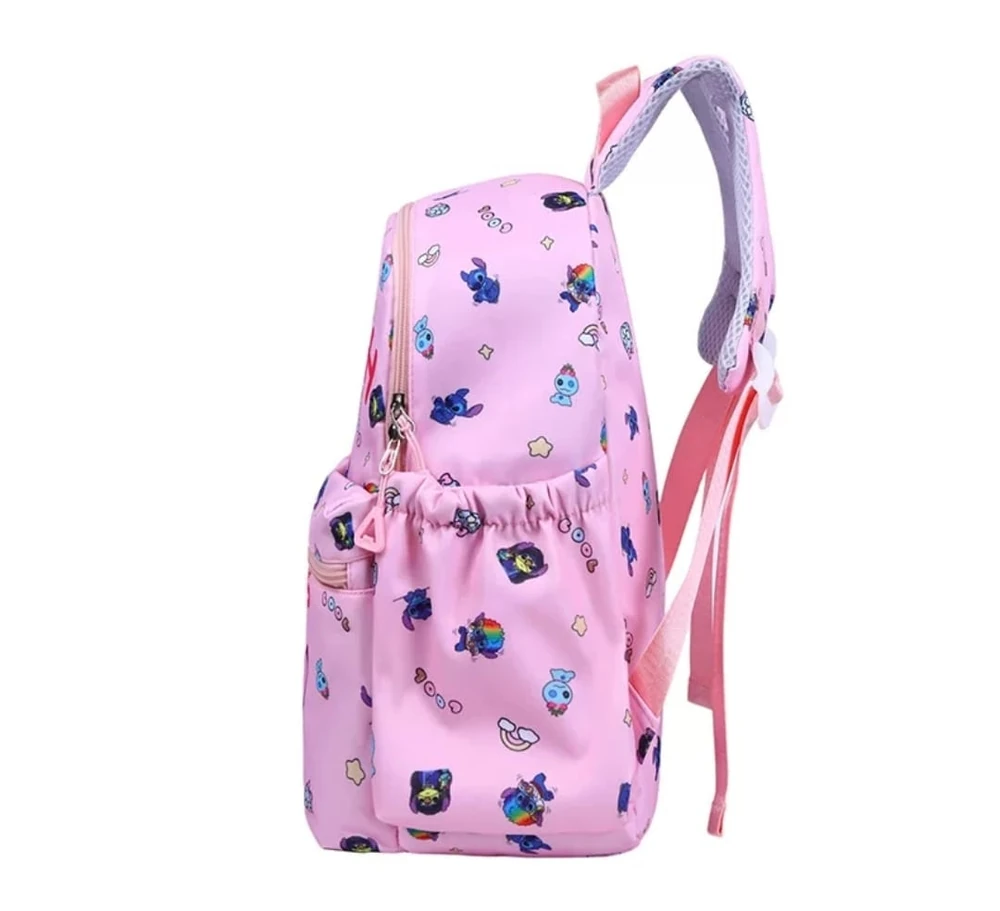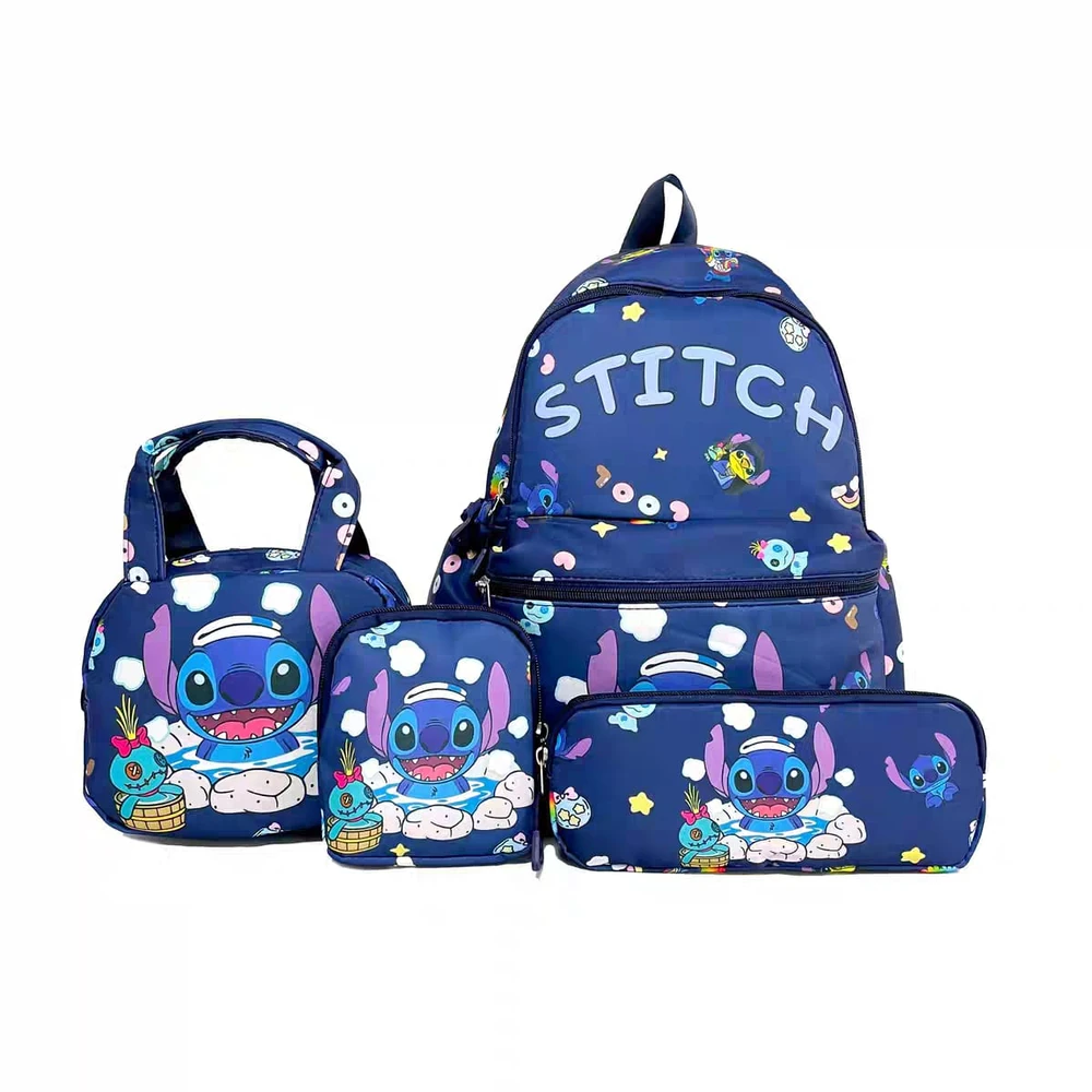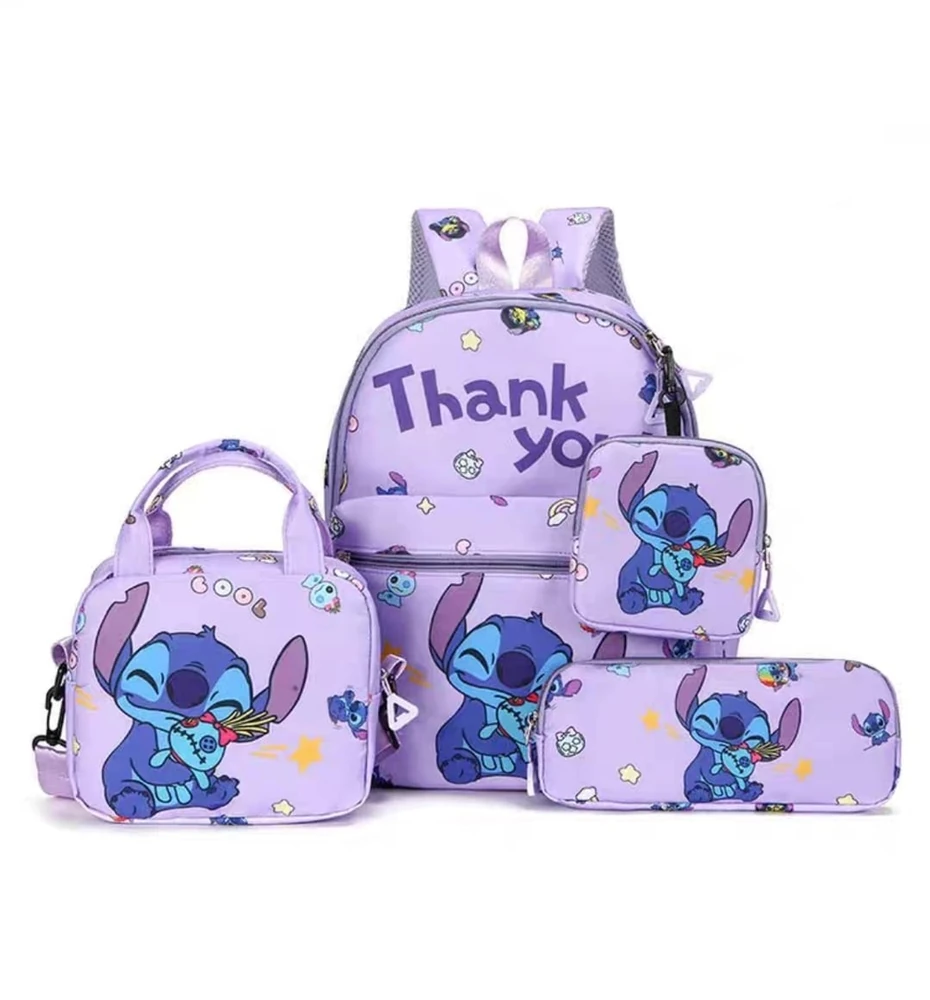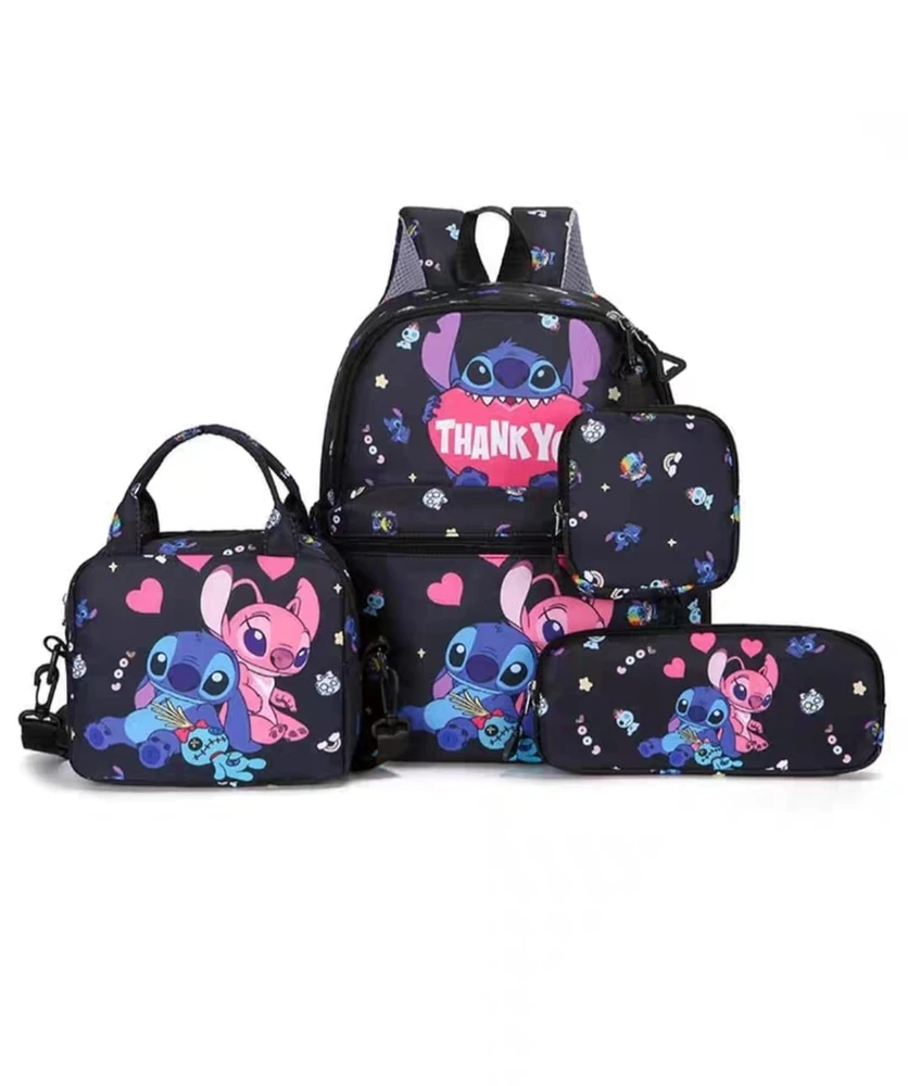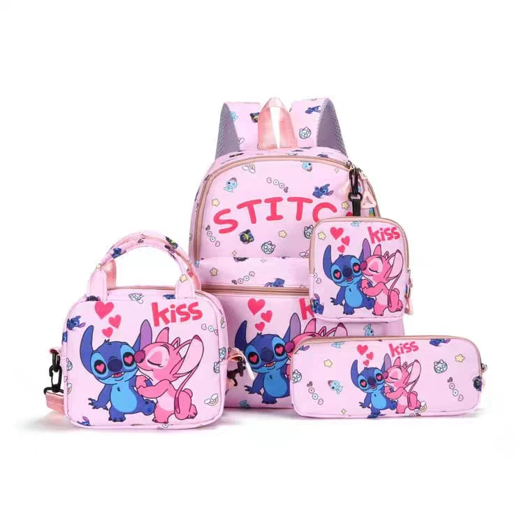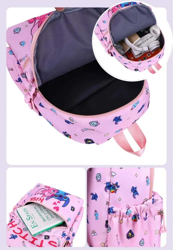 Una mochila escolar infantil Stitch que cuenta con 3 piezas más: