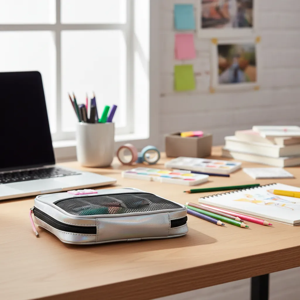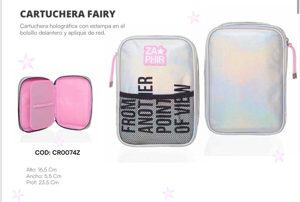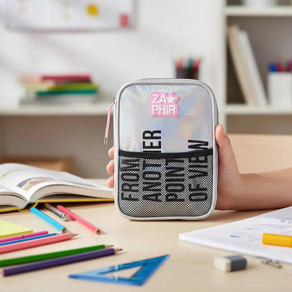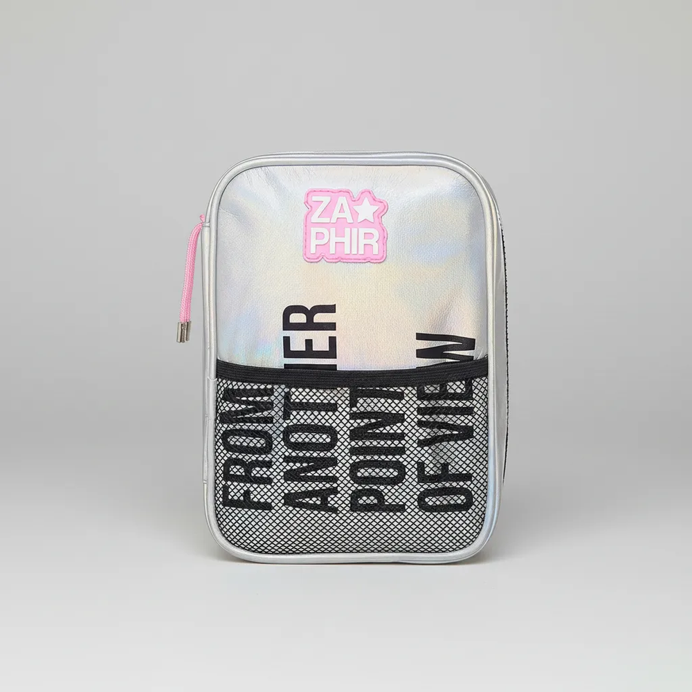 Cartuchera holográfica con estampa en el bolsillo delantero y aplique de red