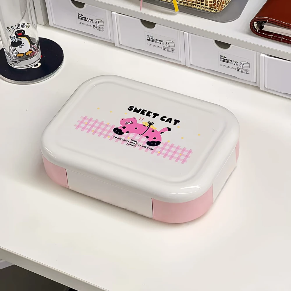 (Lonchera "Sweet Cat" apto microonda, frezeer y lavavajilla. Su función principal es llevar comida de forma segura y organizada fuera de casa, ya sea para el trabajo, la escuela o un picnic. Dispone de compartimentos que permiten separar diferentes tipos de alimentos).