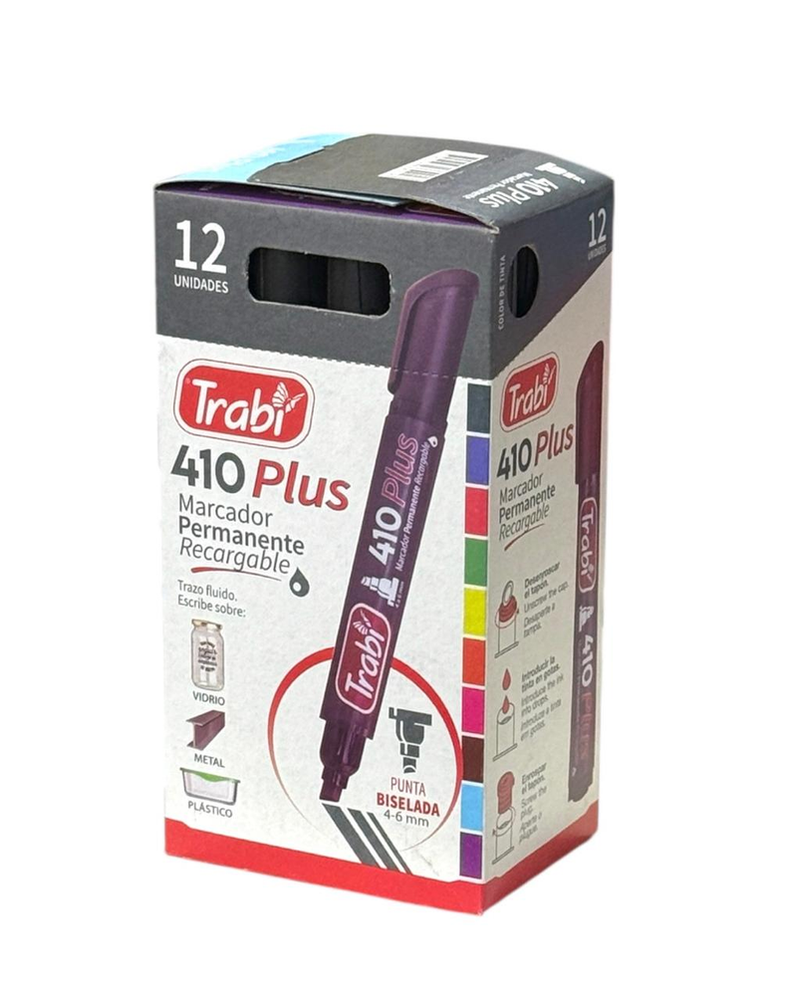 Marcadores de tinta permanente Trabi 411, resistentes, recargables y de secado instantáneo. Diseñados con punta redonda de fibra acrílica para trazos de 4 mm a 6 mm, ofrecen una escritura fluida, uniforme y precisa sobre múltiples superficies. Su tinta al solvente resistente al agua asegura resultados duraderos y definidos, sin decoloración ni borrones, incluso en usos prolongados.