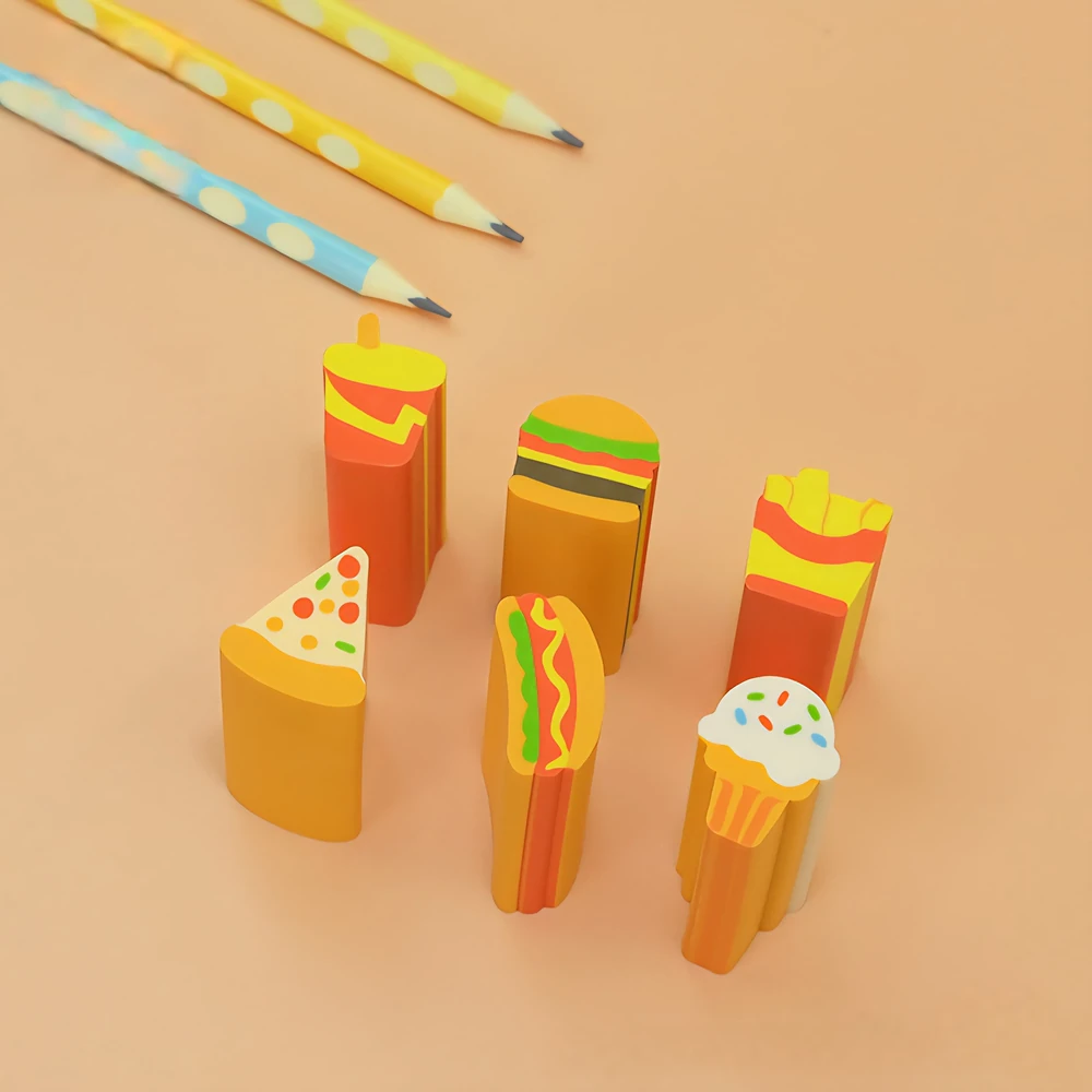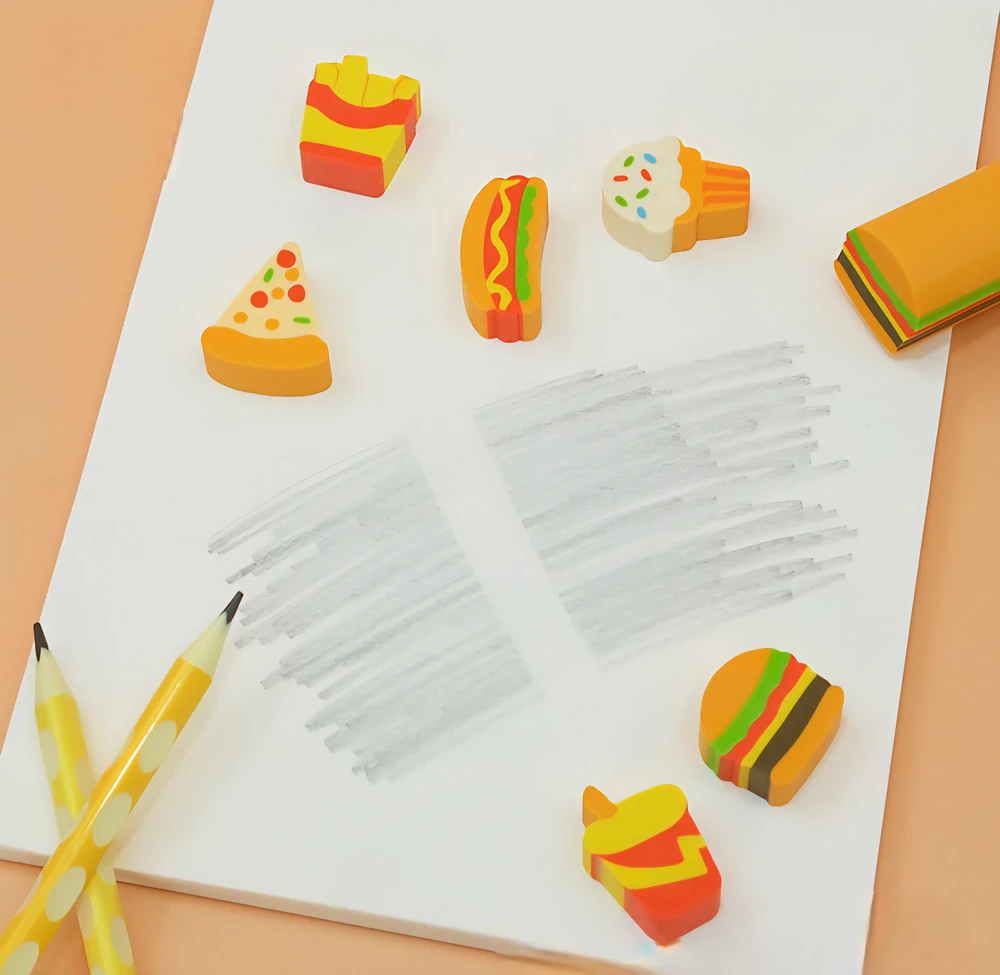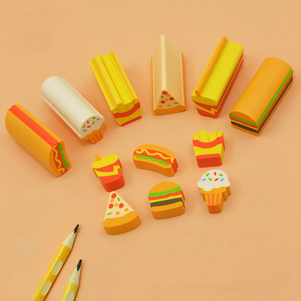 (Goma de borrar en forma de hamburguesas, panchos, pizza, papas fritas, helado y gaseosa. Tiene un diseño alargado para que puedas cortarlo en pedacitos que desees. Cada caja cuenta con 6 set surtidos).