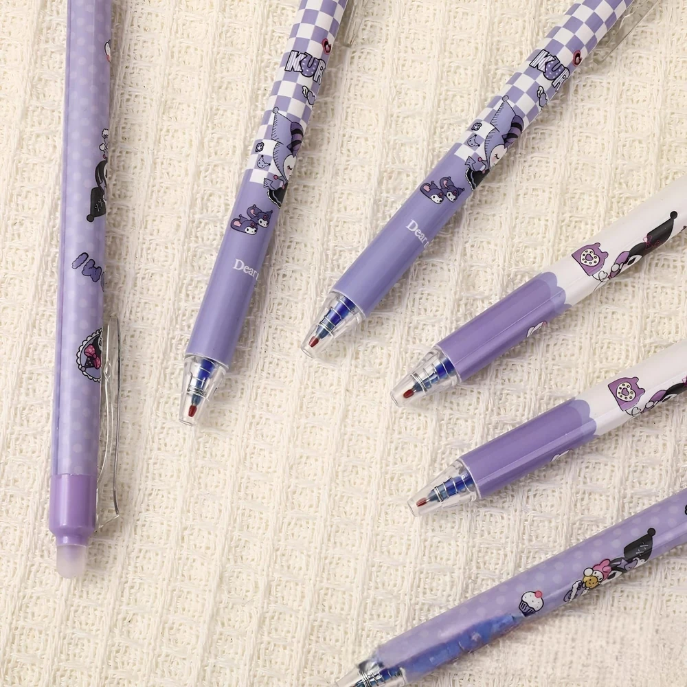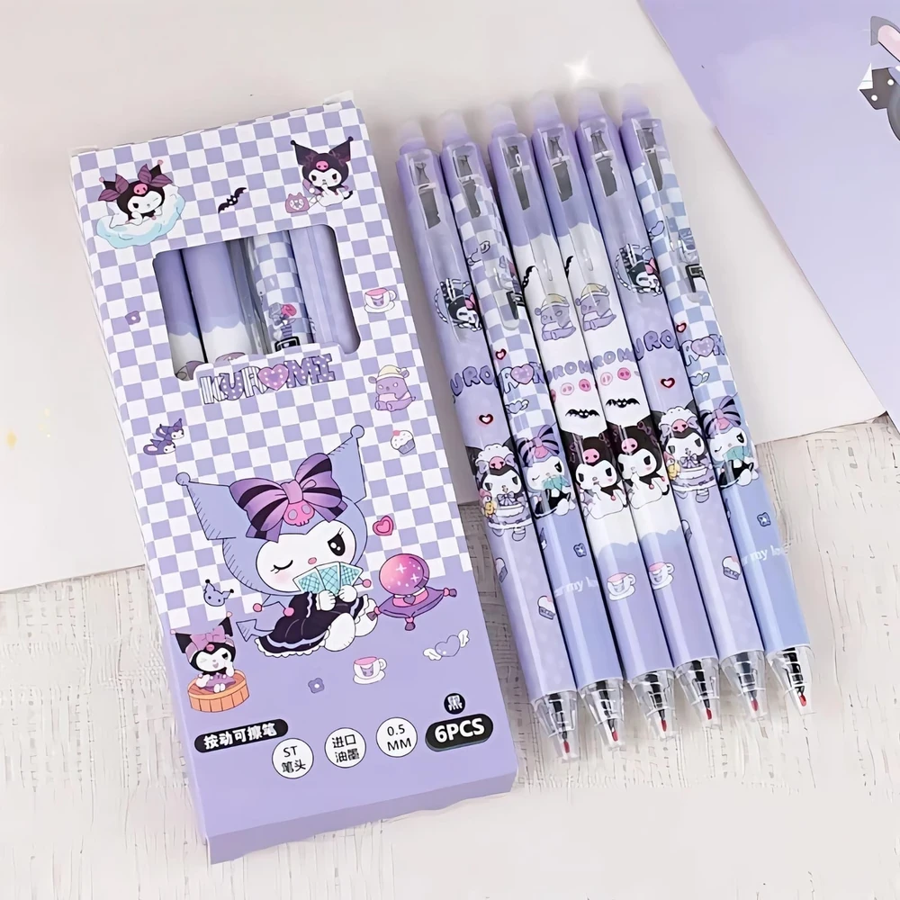 (Cuenta con 6 biromes de color negro con mecanismo retráctil con diseño de "Kuromi" y un gancho. Ideal para regalar).