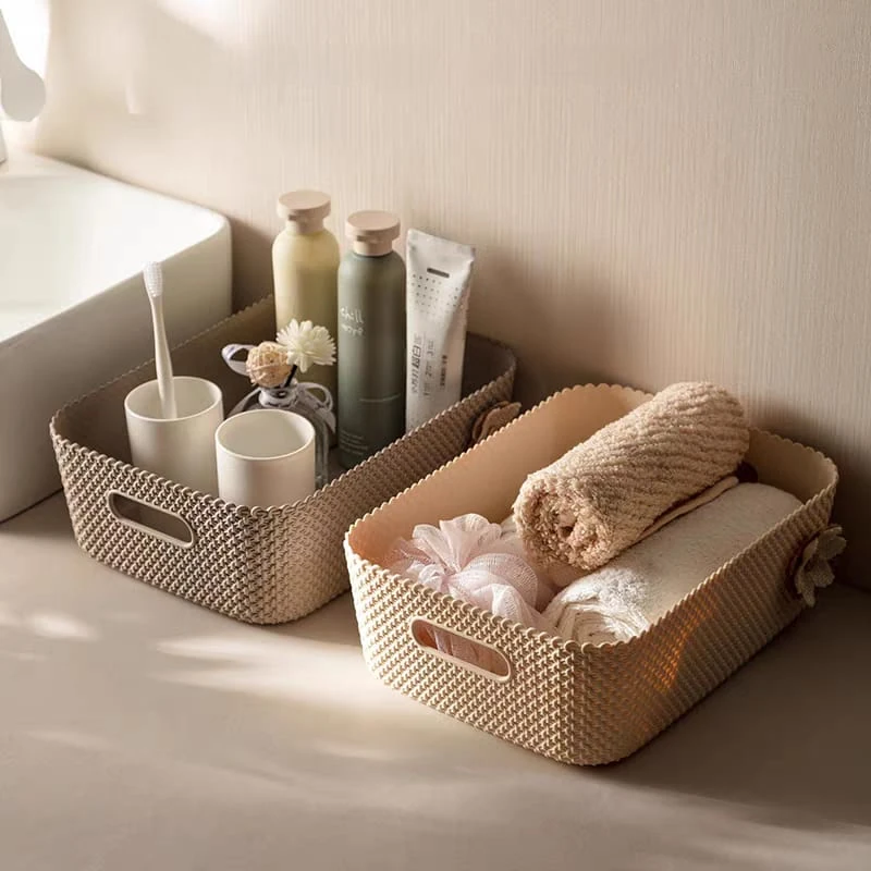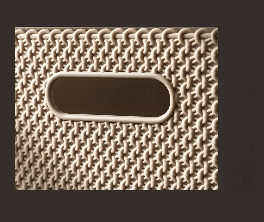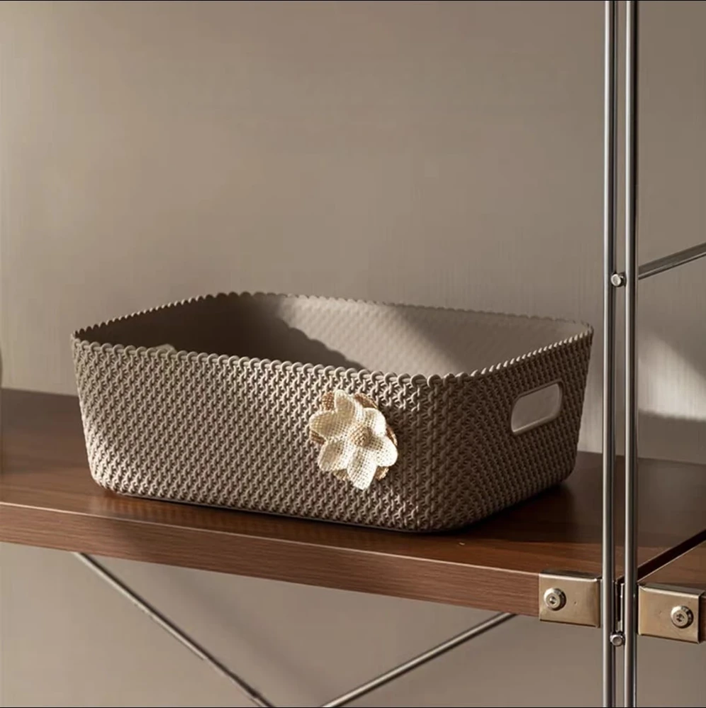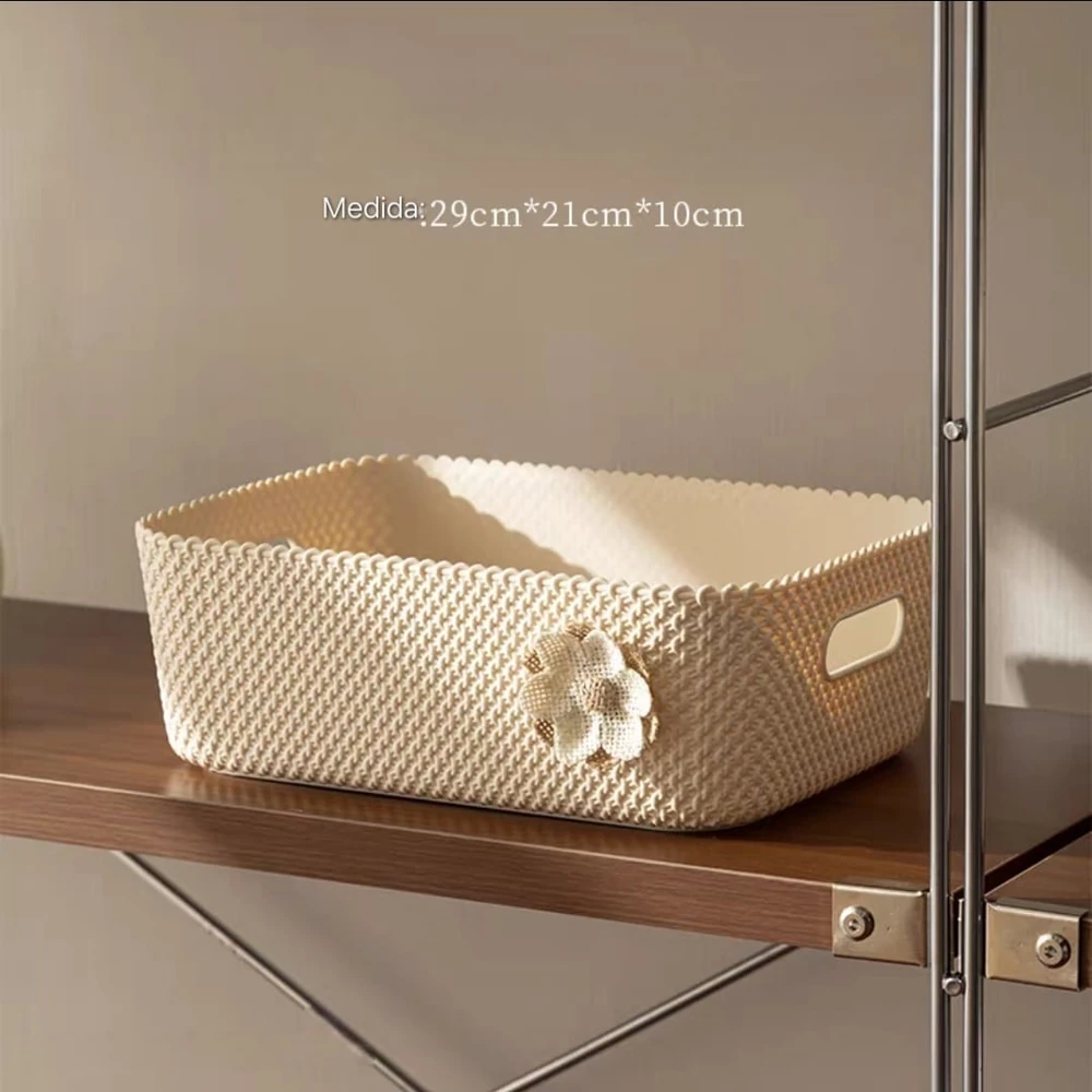 (Canasta de almacenamiento, específicamente una cesta de almacenamiento estilo ratán. Sirve para organizar, almacenar y optimizar espacios en diferentes áreas del hogar como habitaciones, baños, estudios, armarios, lavanderías, etc).