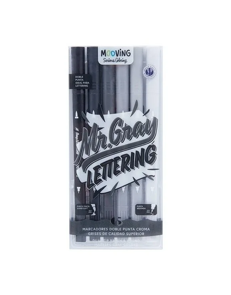 Marcadores Mr. Gray en Gama de colores grises y negros. Punta pincel de un lado de 4,4mm y del otro punta redonda de 2,5mm tinta a base de agua, de larga duración. Punta Súper soft