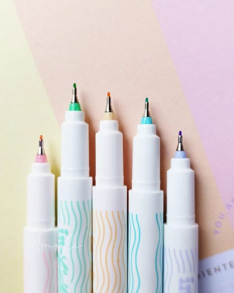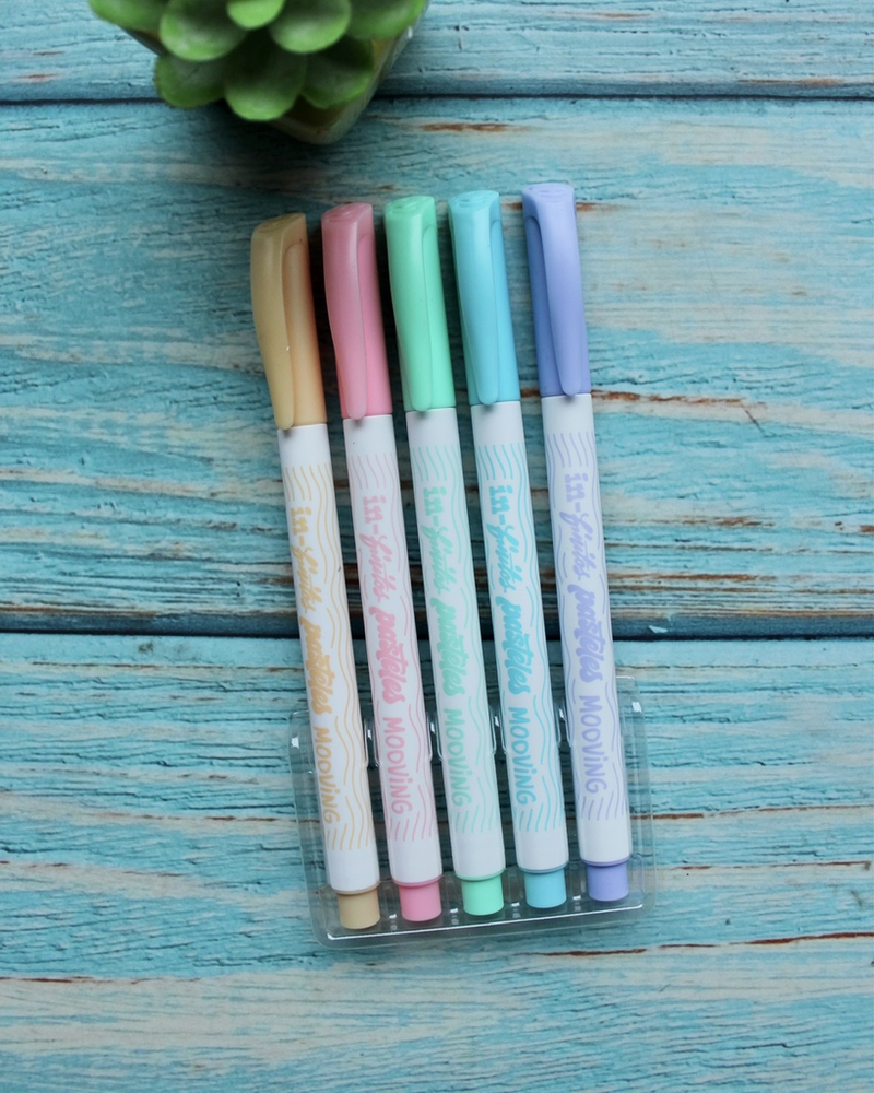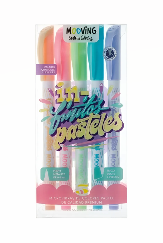 Descubre la experiencia de escribir con estilo y delicadeza con los Marcadores Mooving Microfibras Infinitos Pasteles. Este juego incluye 5 marcadores de colores suaves y relajantes que transformarán tus notas y dibujos en obras de arte sutiles.