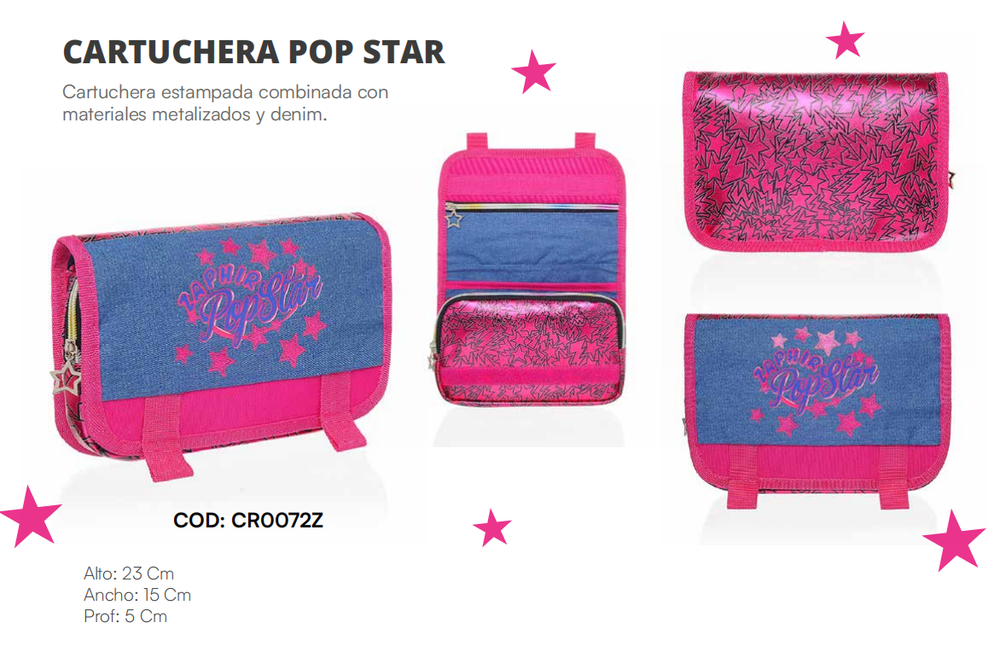 Cartuchera estampada cominada con materiales metalizados y denim