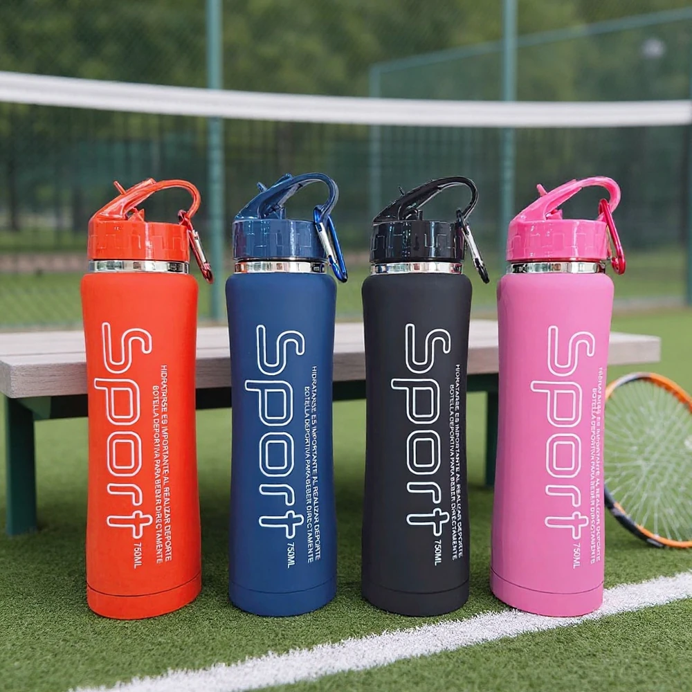 (Botella con pico rebatible y sorbete, Están fabricadas en acero inoxidable de doble capa, el exterior de la botella tiene una pintura engomada antideslizante para un mejor agarre. Cuentan con un tapón hermético que evita derrames y un gancho para colgarlas en una mochila, lo que las hace muy prácticas para llevar al gimnasio, al colegio o a cualquier otra actividad).