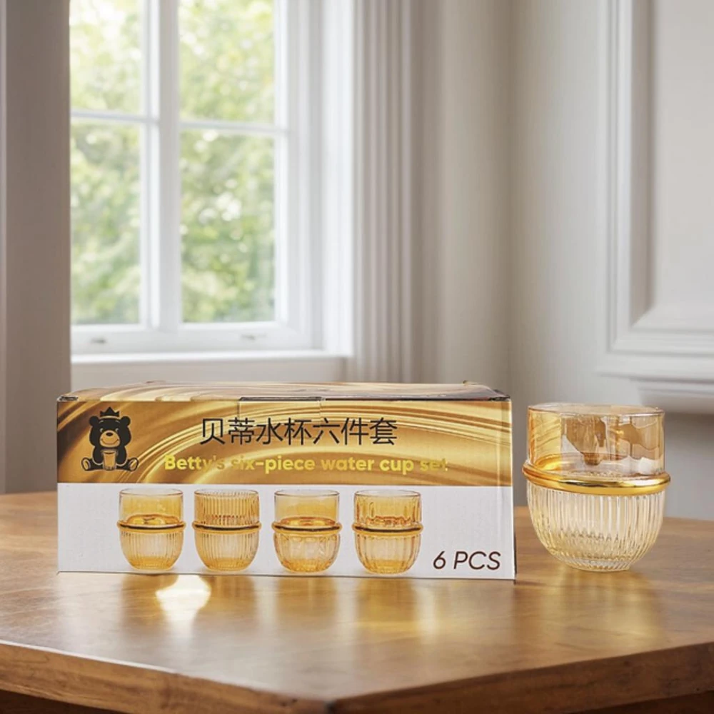 (Juego de 6 vasos de vidrio con detalles en dorado)