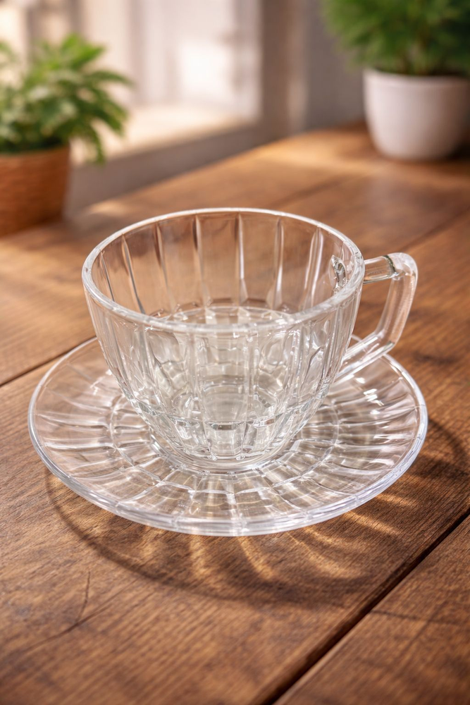 6 Taza de te + plato de vidrio, 250 ml aprox. taza medida: 7.5 cm(altura) y de plato: 14cm