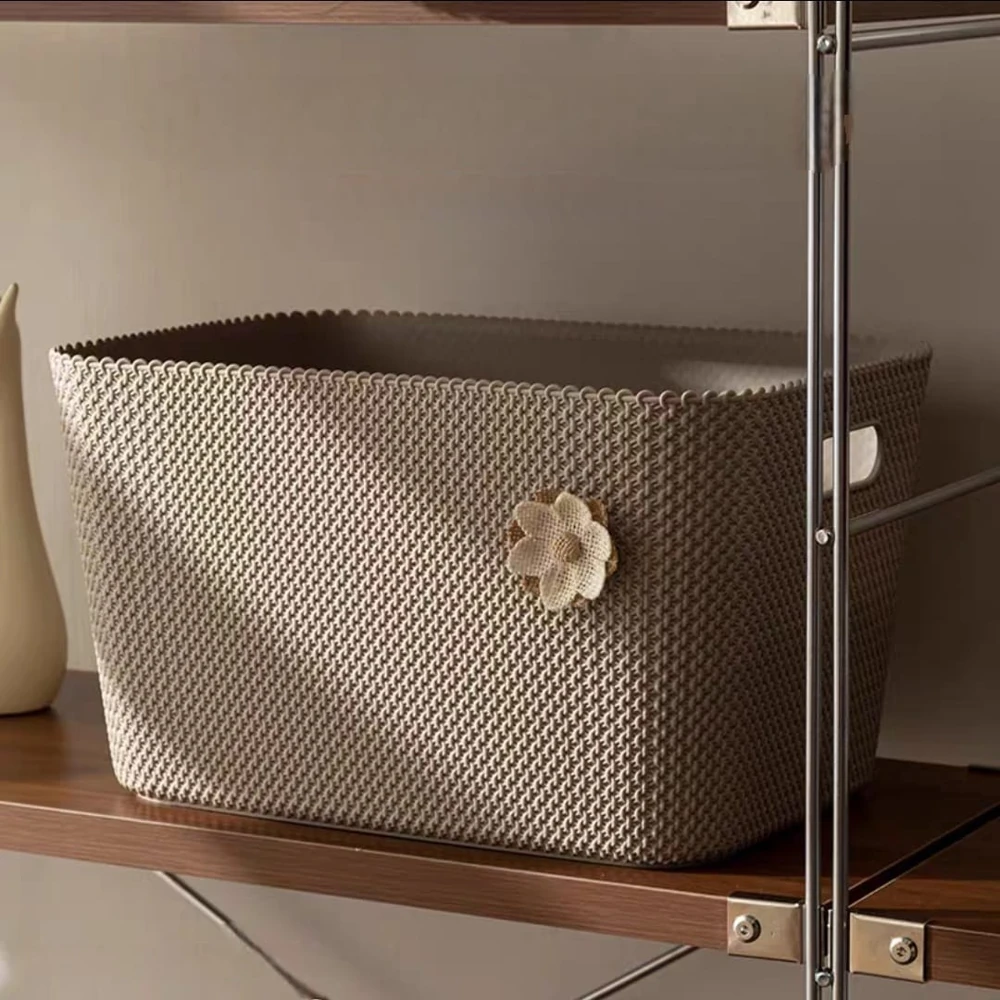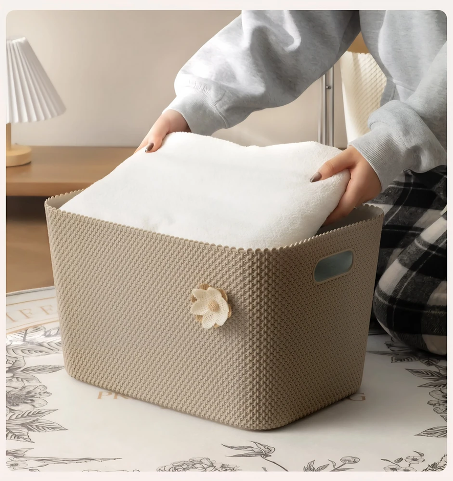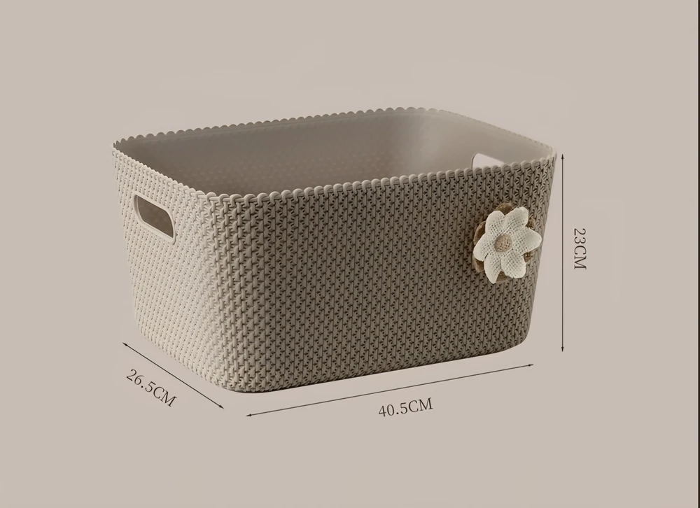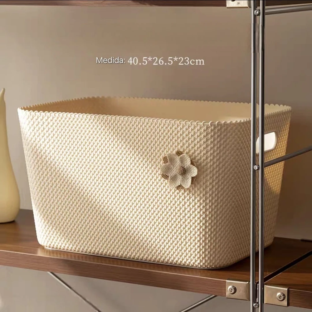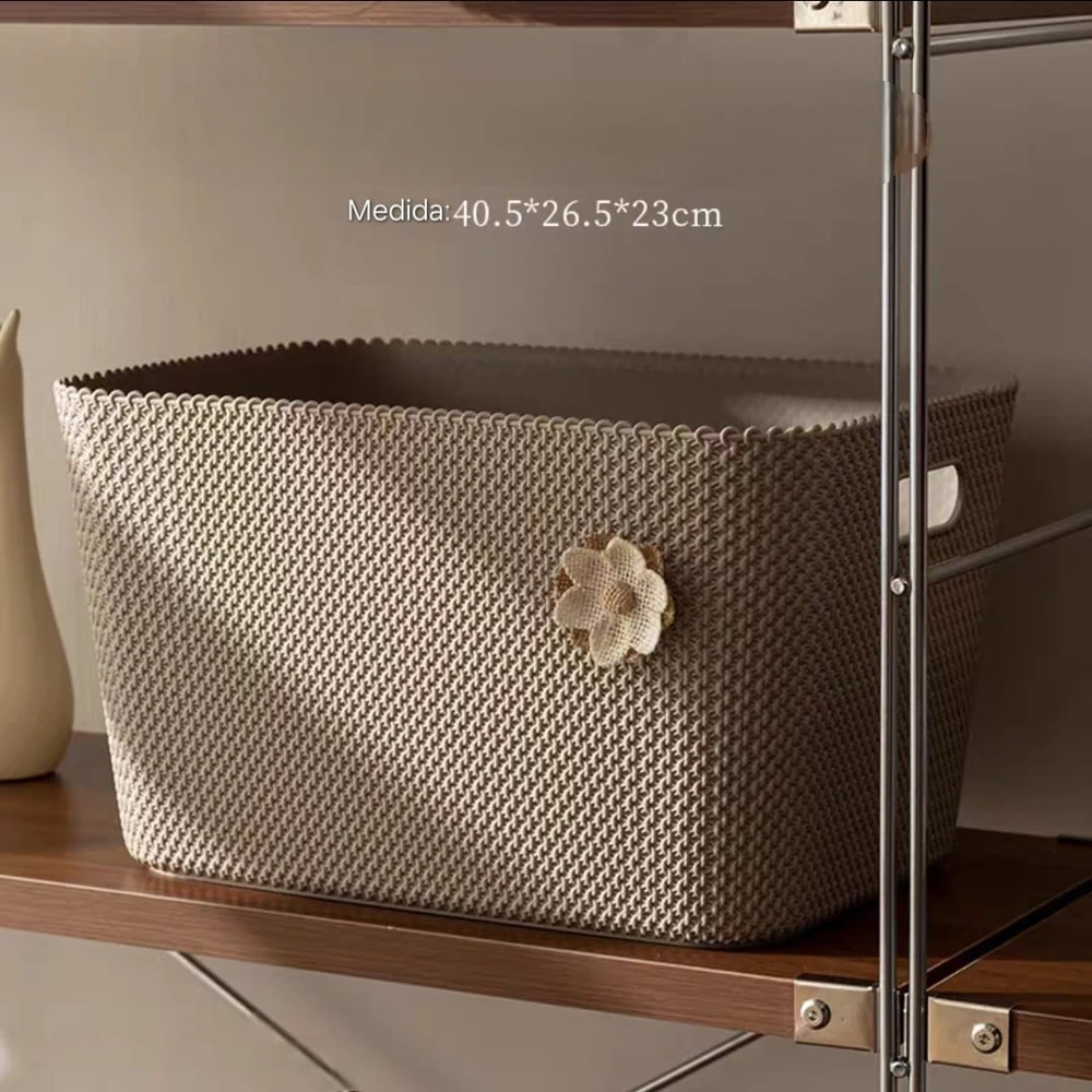 (Canasta de almacenamiento, específicamente una cesta de almacenamiento estilo ratán. Sirve para organizar, almacenar y optimizar espacios en diferentes áreas del hogar como habitaciones, baños, estudios, armarios, lavanderías, etc).