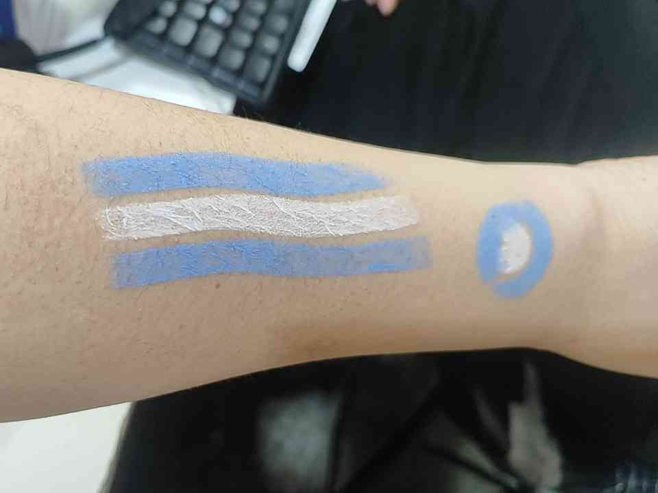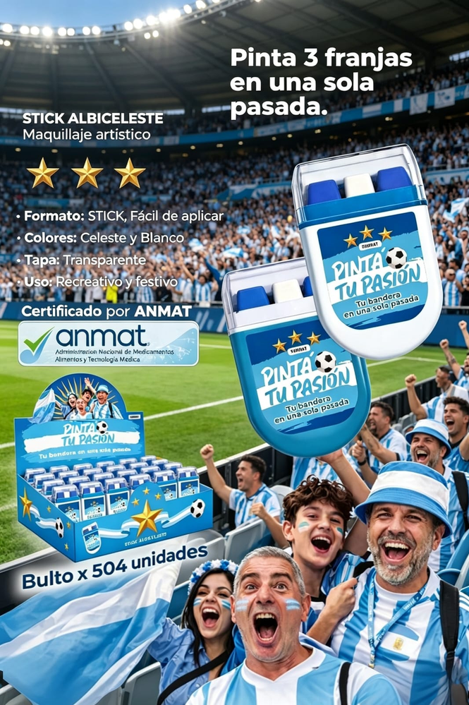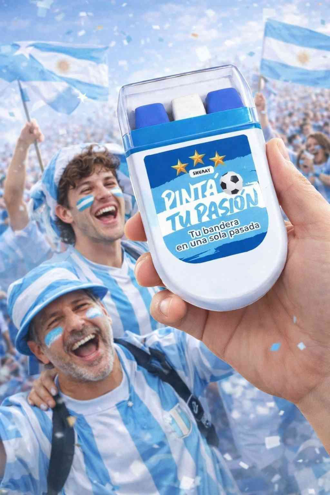 Maquillaje artístico para rostro - Diseño inspirado en la bandera argentina - Colores celeste y blanco - Formato compacto y portátil - Fácil de aplicar - Ideal para partidos, Mundial, selección, eventos patrios y celebraciones - Presentación práctica para llevar en bolso, mochila o cartera