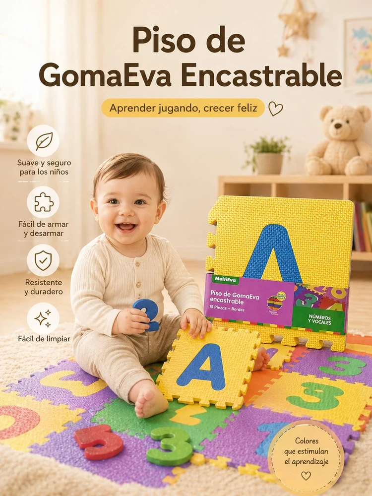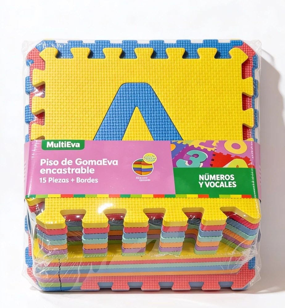 Piso de GomaEva Encastrable de Números y vocales de 15 piezas + bordes tiene de espesor 10mm es fácil de armar y desarmar, no es tóxico es antideslizante y lavable.